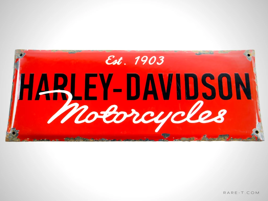 This is a weathered patina porcelain/enamel HARLEY-DAVIDSON dealership sign.