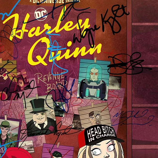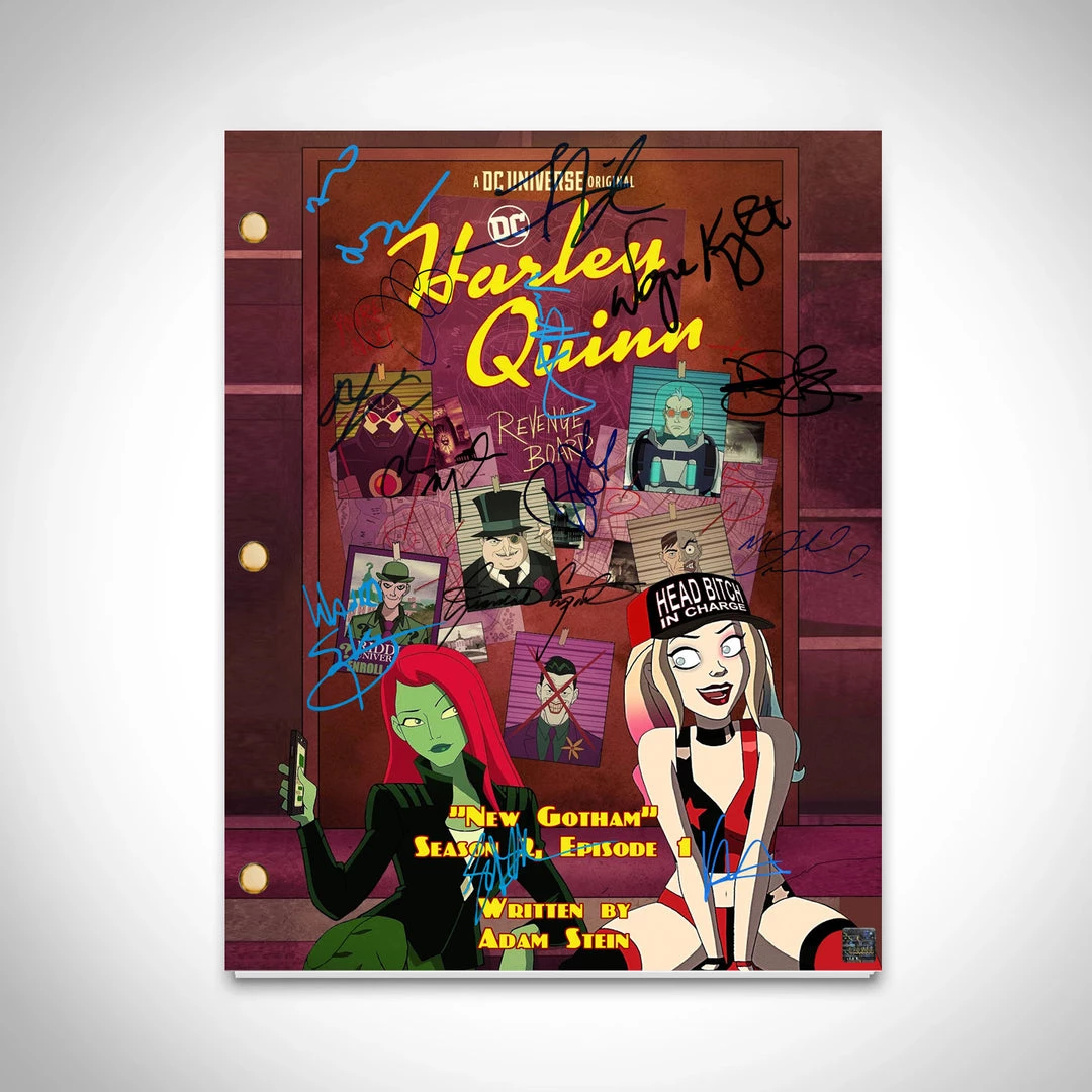 Pay homage to Harley Quinn , with this Warner Bros / DC Universe fully licensed facsimile of the official signed TV Series Transcript , originally signed by actors Kaley Cuoco, Lake Bell, Alan Tudyk, Ron Funches, Tony Hale, Jason Alexander, Diedrich Bader, Christopher Meloni, J.B.Smoove, James Adomian, Wayne Knight, Wanda Sykes, Michael Ironside & Giancarlo Esposito , of which is strictly limited to 100 units Worldwide and has been approved and numbered accordingly.