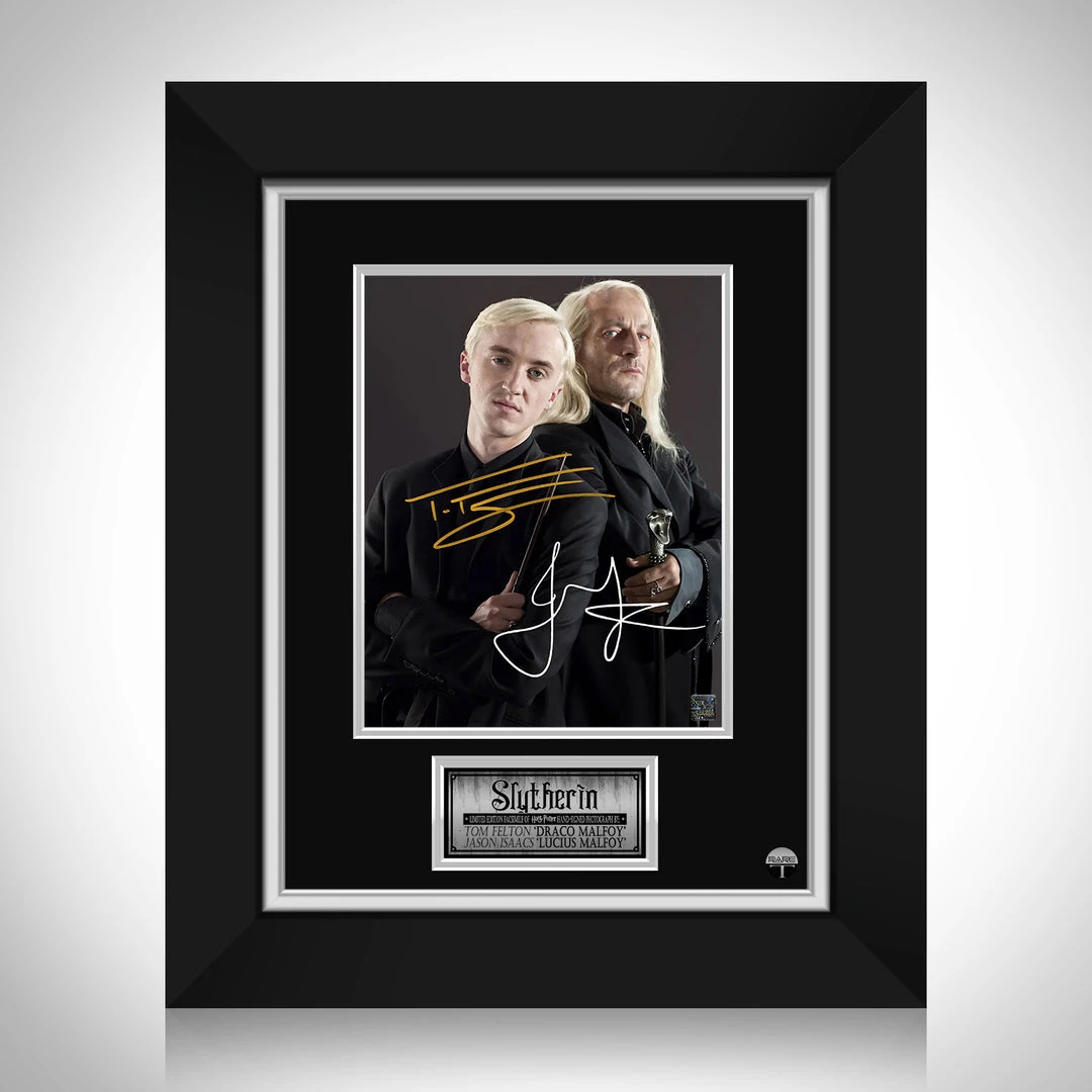 Pay homage to Draco & Lucius Malfoy, with this gallery-framed, officially licensed, limited edition facsimile of the Hand-Signed photo, originally signed by Tom Felton & Jason Isaacs, of which is strictly limited to 100 units Worldwide, and has been approved and numbered accordingly.