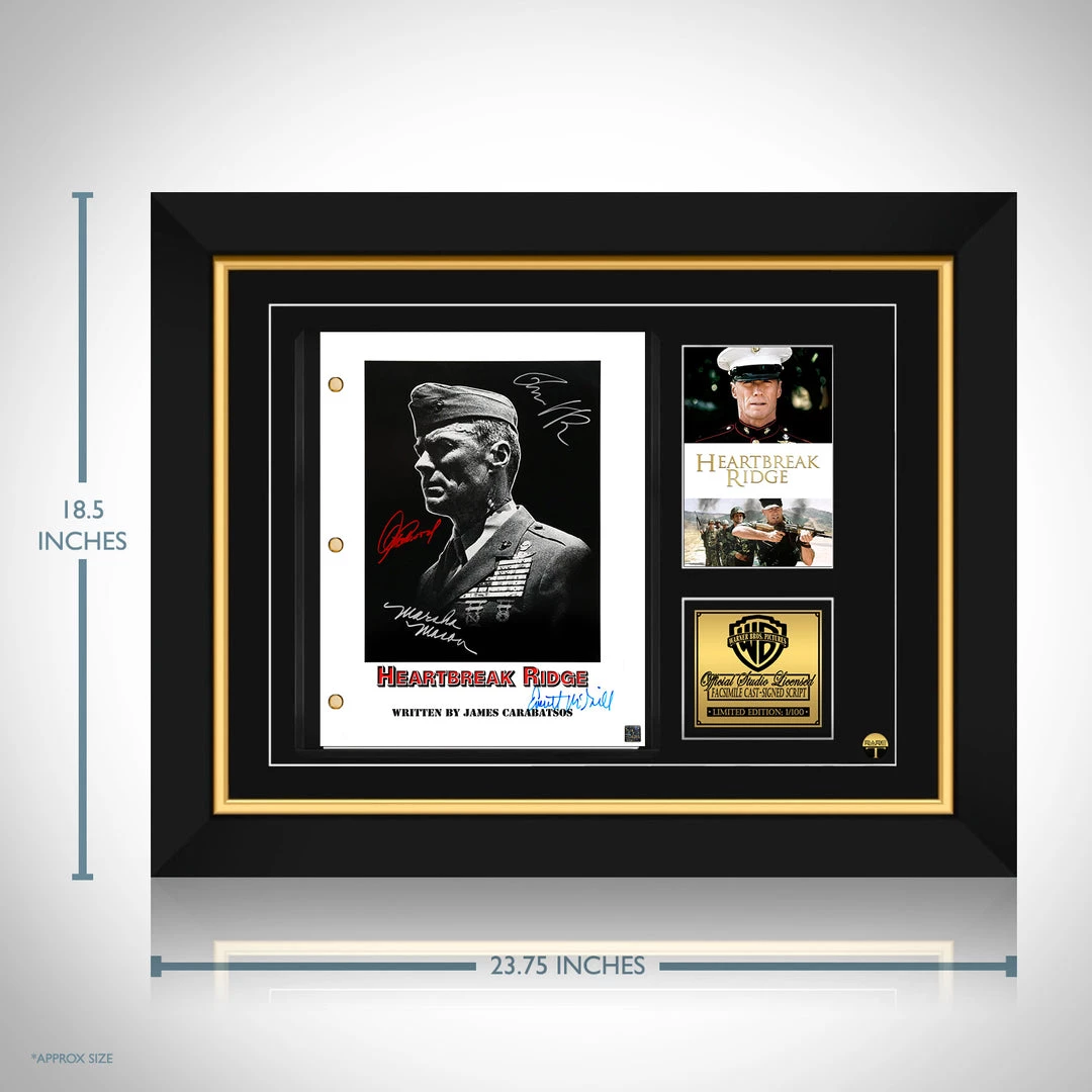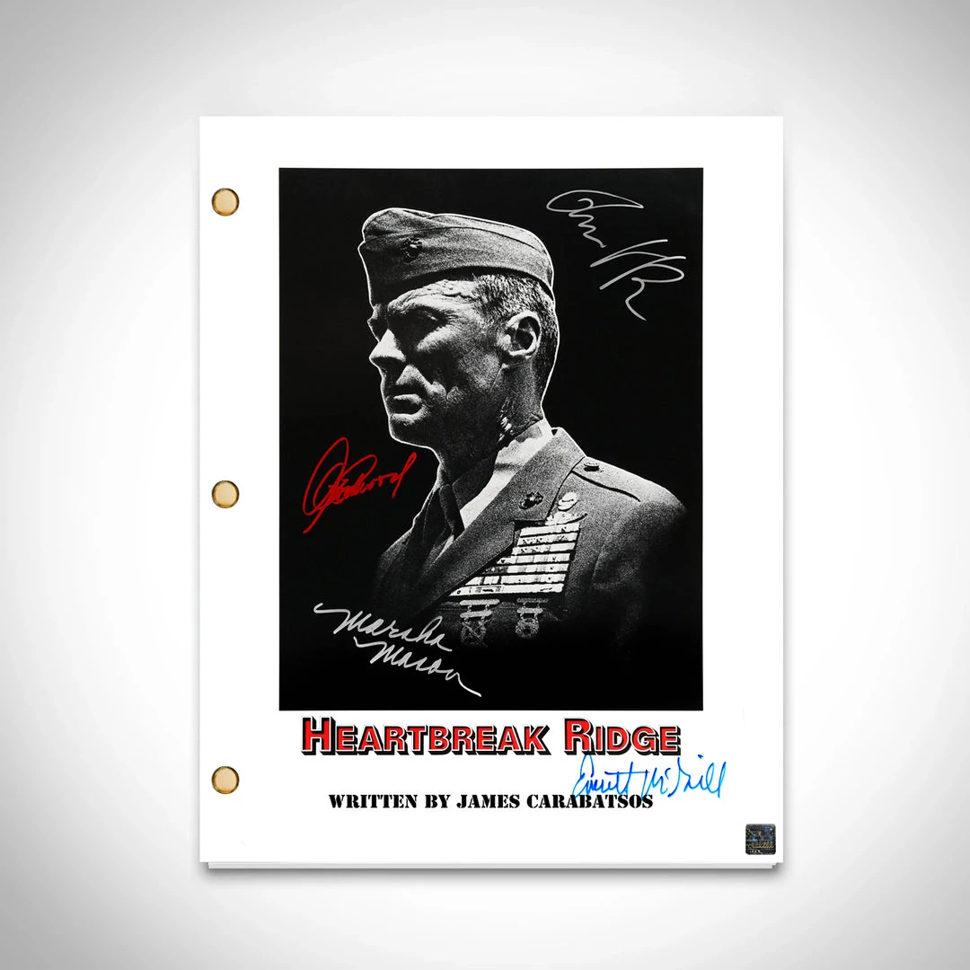 Pay homage to Heartbreak Ridge , with this Warner Bros fully licensed facsimile of the official signed movie transcript, originally signed by actors Clint Eastwood, Marsha Mason, Everett McGill & Mario Van Peebles , of which is strictly limited to 100 units Worldwide and has been approved and numbered accordingly.