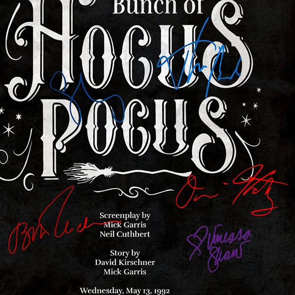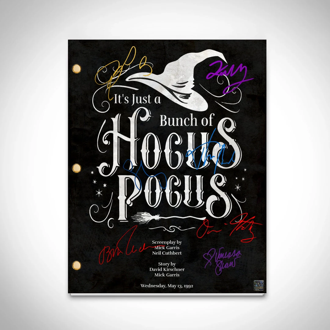 Pay homage to Hocus Pocus , with this Walt Disney Studios fully licensed facsimile of the official signed movie script, originally signed by actors Bette Midler, Sarah Jessica Parker, Kathy Najimy, Omari Katz, Thora Birch, Vinessa Shaw & Sean Murray , of which is strictly limited to 100 units Worldwide and has been approved and numbered accordingly.