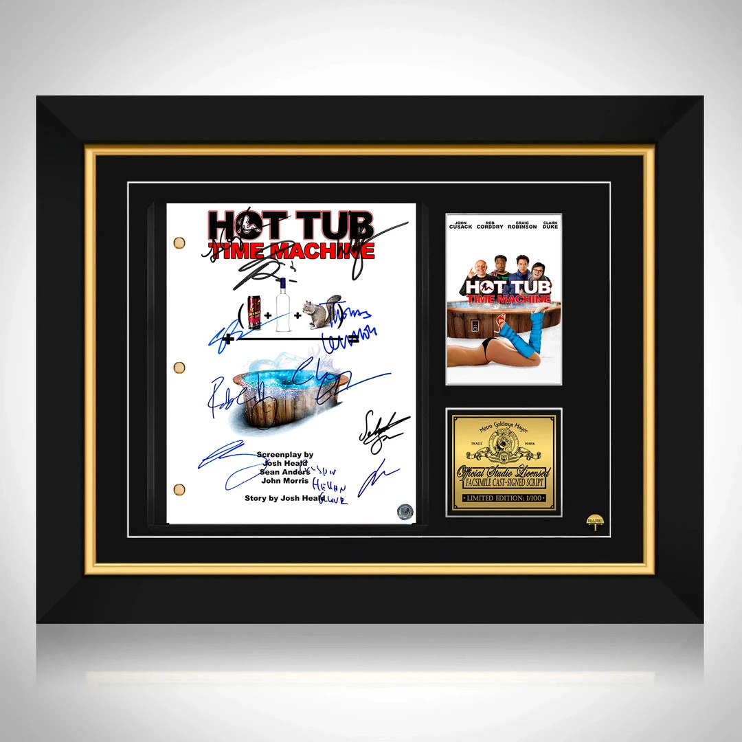 Pay homage to Hot Tub Time Machine , with this MGM Studios fully licensed facsimile of the official signed movie script, originally signed by actors John Cusack, Rob Corddry, Craig Robinson, Clark Duke, Crispin Glover, Lizzy Caplan, Chevy Chase, Sebastian Stan, Jessica Paré, William Zabka & Thomas Lennon , of which is strictly limited to 100 units Worldwide and has been approved and numbered accordingly.