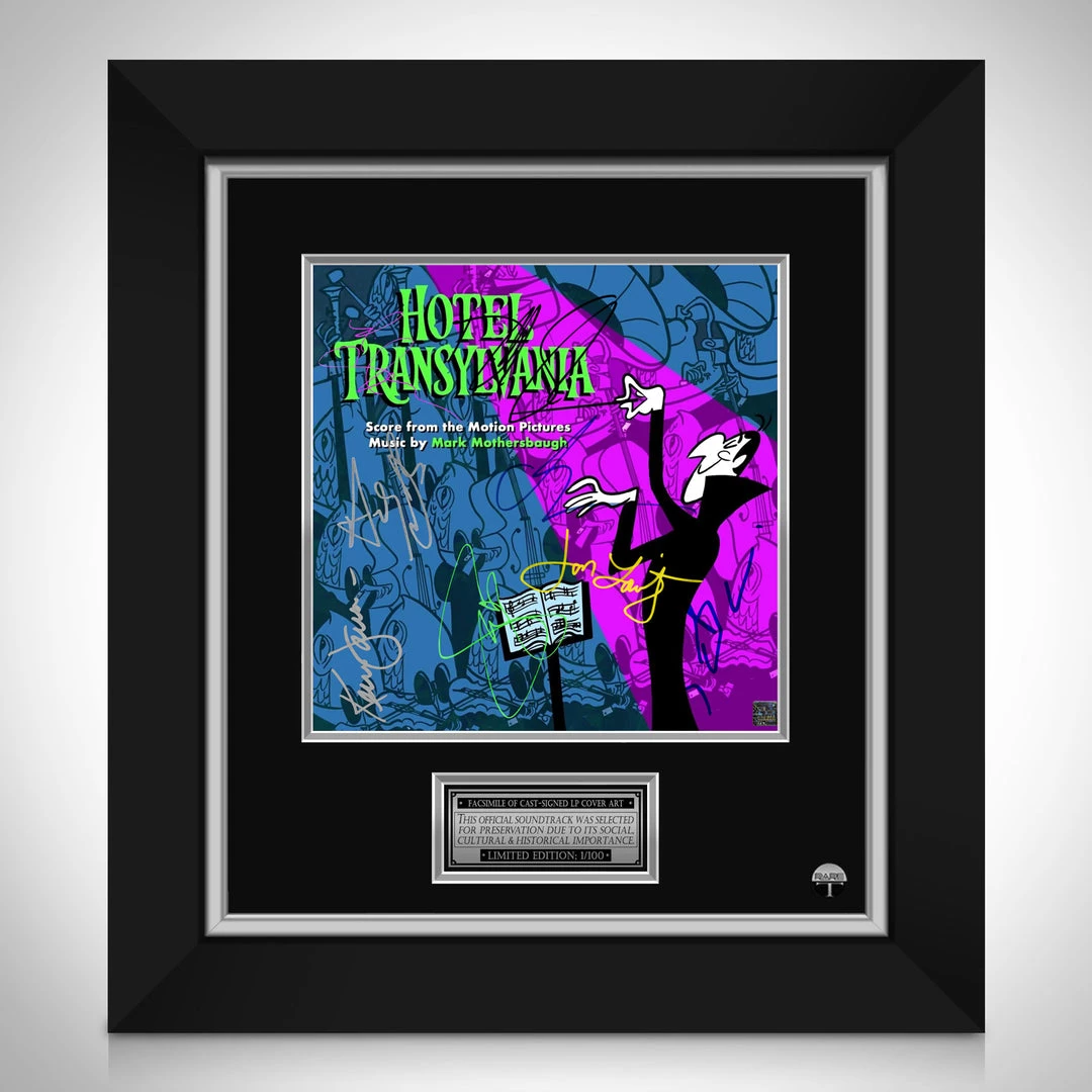 Pay homage to one of the most iconic movie of all time, Hotel Transylvania , with this gallery-framed, officially licensed, limited edition facsimile of the Hand-Signed Soundtrack LP Cover originally signed by Adam Sandler, Andy Samberg, Selena Gomez, Kevin James, Steve Buscemi, David Spade, Ceelo Green & Jon Lovitz , of which is strictly limited to 100 units Worldwide, and has been approved and numbered accordingly.