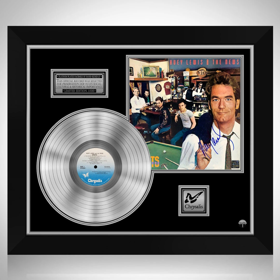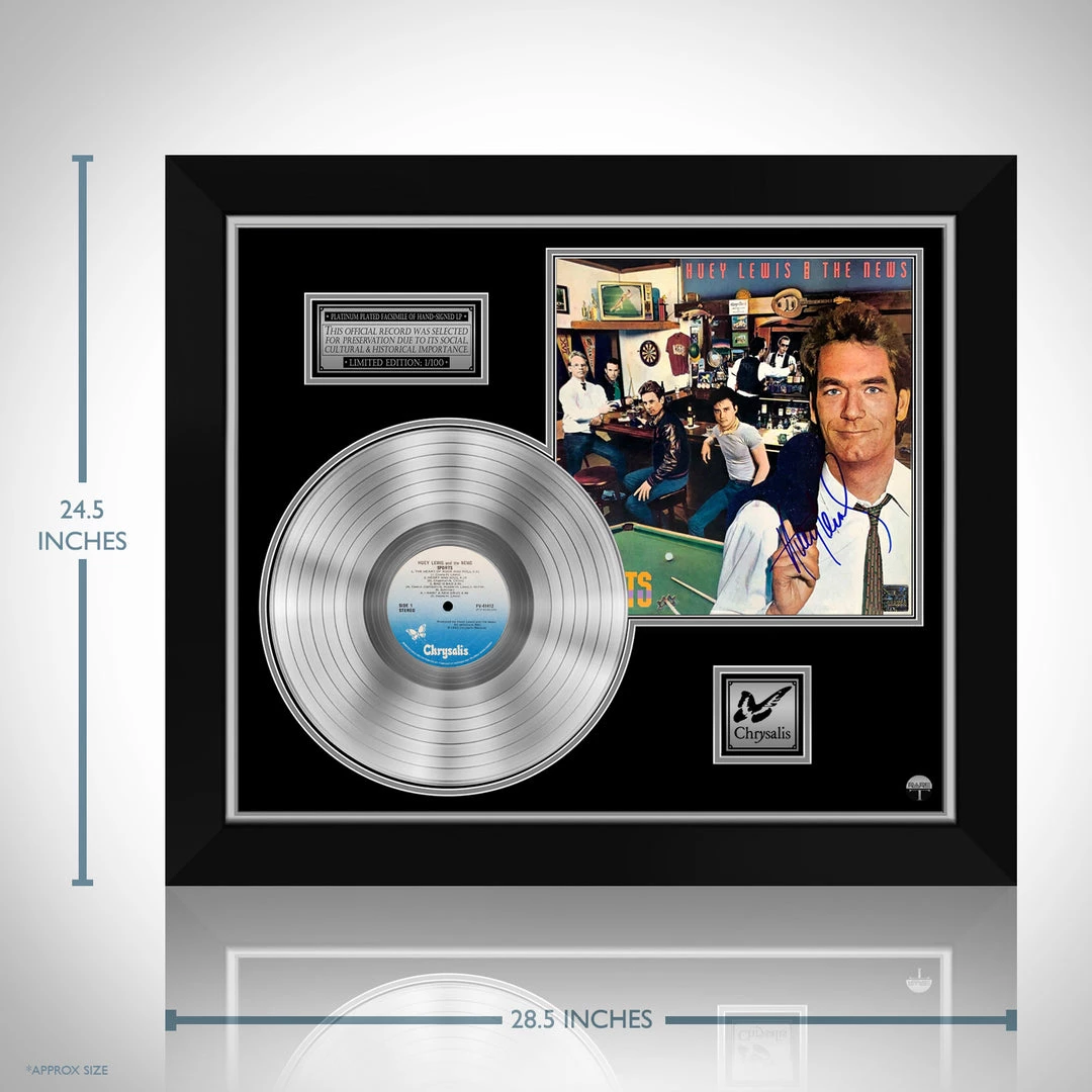 Pay homage to one of the most iconic musician of all time Huey Lewis and the News , with this gallery-framed, authentic Chrysalis Records fully licensed facsimile of the official Hand-Signed Platinum Plated LP Record and LP Cover Sports Originally signed by Huey Lewis , of which is strictly limited to 100 units Worldwide and has been approved and numbered accordingly.