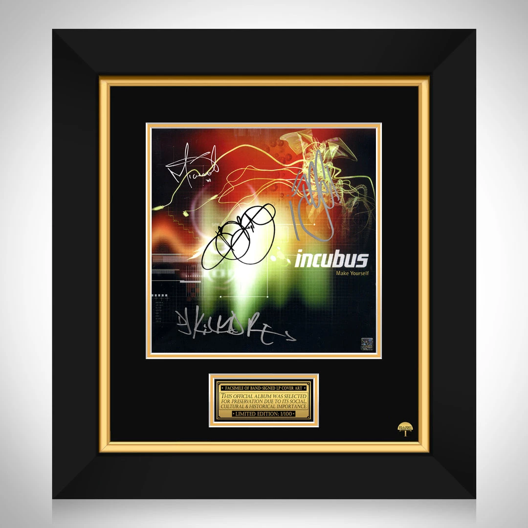 Pay homage to one of the most iconic American rock band of all time, Incubus , with this gallery-framed, officially licensed, limited edition facsimile of the Hand-Signed Make yourself LP Cover originally signed by Brandon Boyd, Mike Einziger, DJ Kilmore & Jose Pasillas , of which is strictly limited to 100 units Worldwide, and has been approved and numbered accordingly.