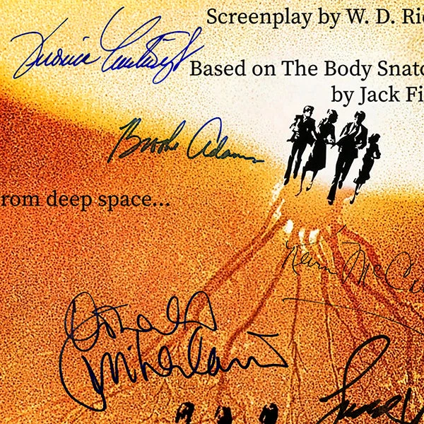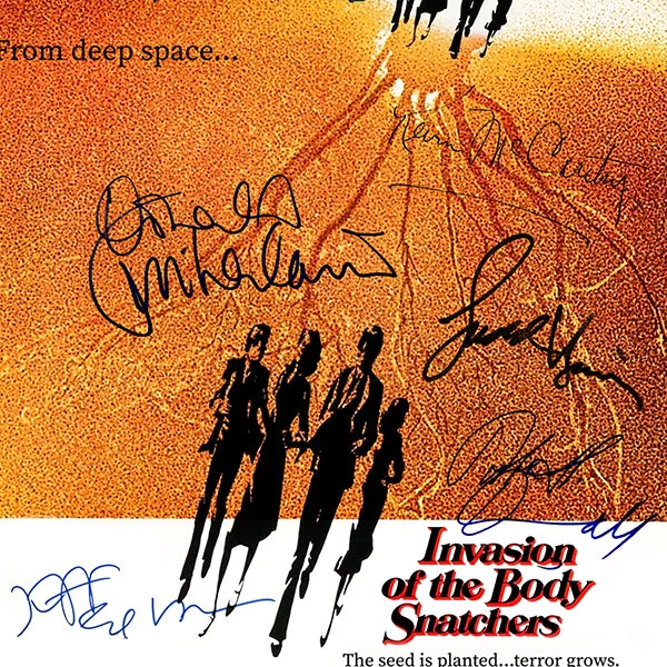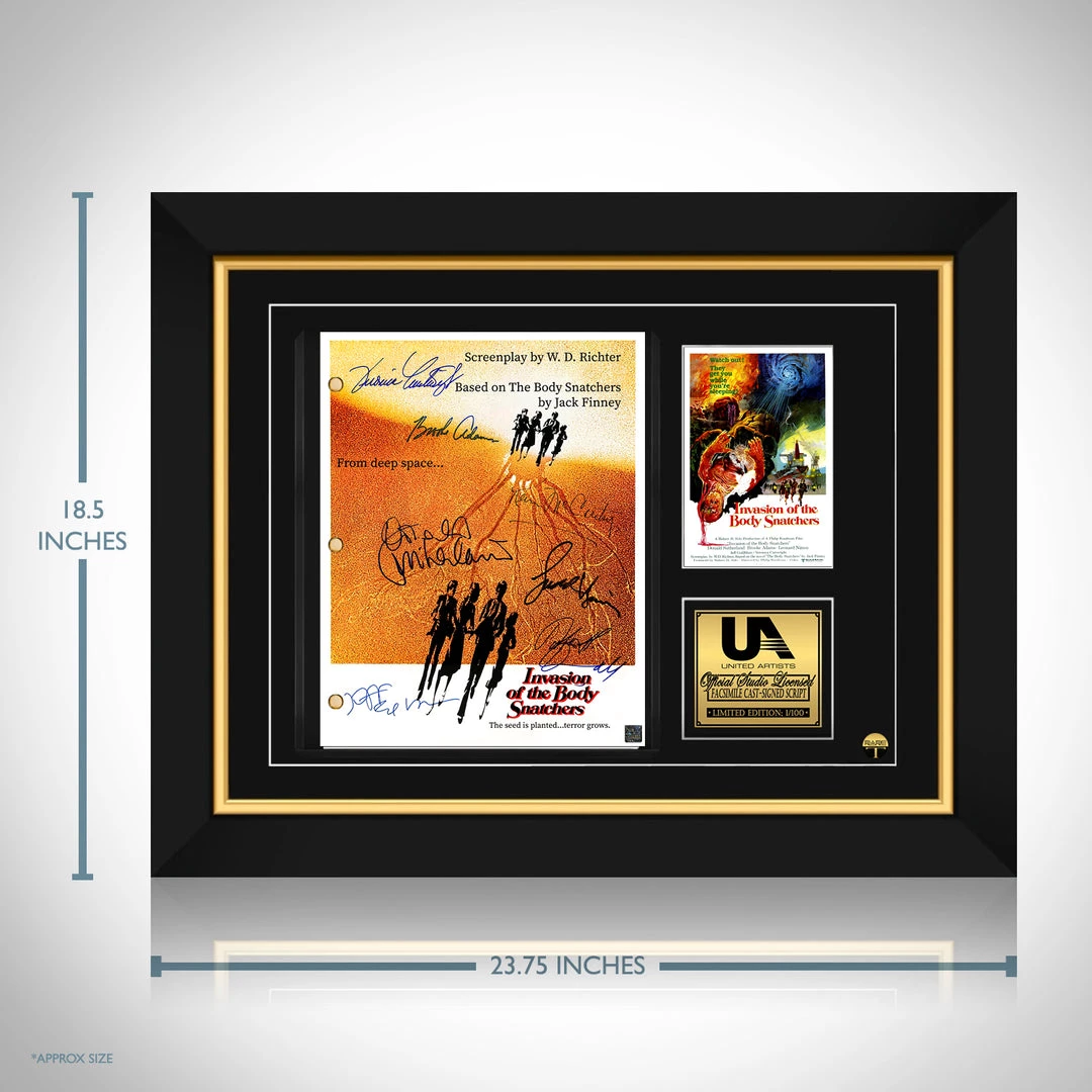 Pay homage to Invasion of the body snatchers 1978 , with this United Artists fully licensed facsimile of the official signed movie Transcript , originally signed by actors Donald Sutherland, Brooke Adams, Leonard Nimoy, Jeff Goldblum, Veronica Cartwright, Kevin McCarthy & Robert Duvall , of which is strictly limited to 100 units Worldwide and has been approved and numbered accordingly.