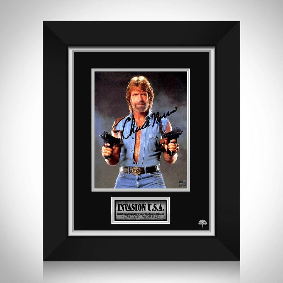 Pay homage to Invasion U.S.A., with this gallery-framed, officially licensed, limited edition facsimile of hand-signed photo, originally signed by Chuck Norris , of which is strictly limited to 100 units Worldwide, and has been approved and numbered accordingly.