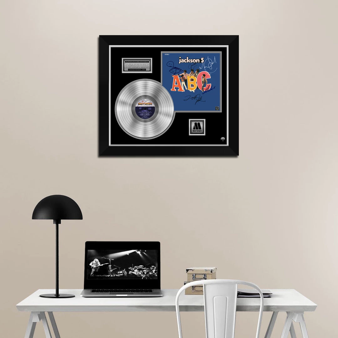 Pay homage to one of the most iconic American pop band of all time Jackson 5 , with this gallery-framed, authentic Motown records fully licensed facsimile of the official Hand-Signed Platinum Plated LP Record and LP Cover ABC Originally signed by Tito Jackson, JackieJackson, Marlon Jackson, Jermaine Jackson & Michael Jackson , of which is strictly limited to 100 units Worldwide and has been approved and numbered accordingly.
