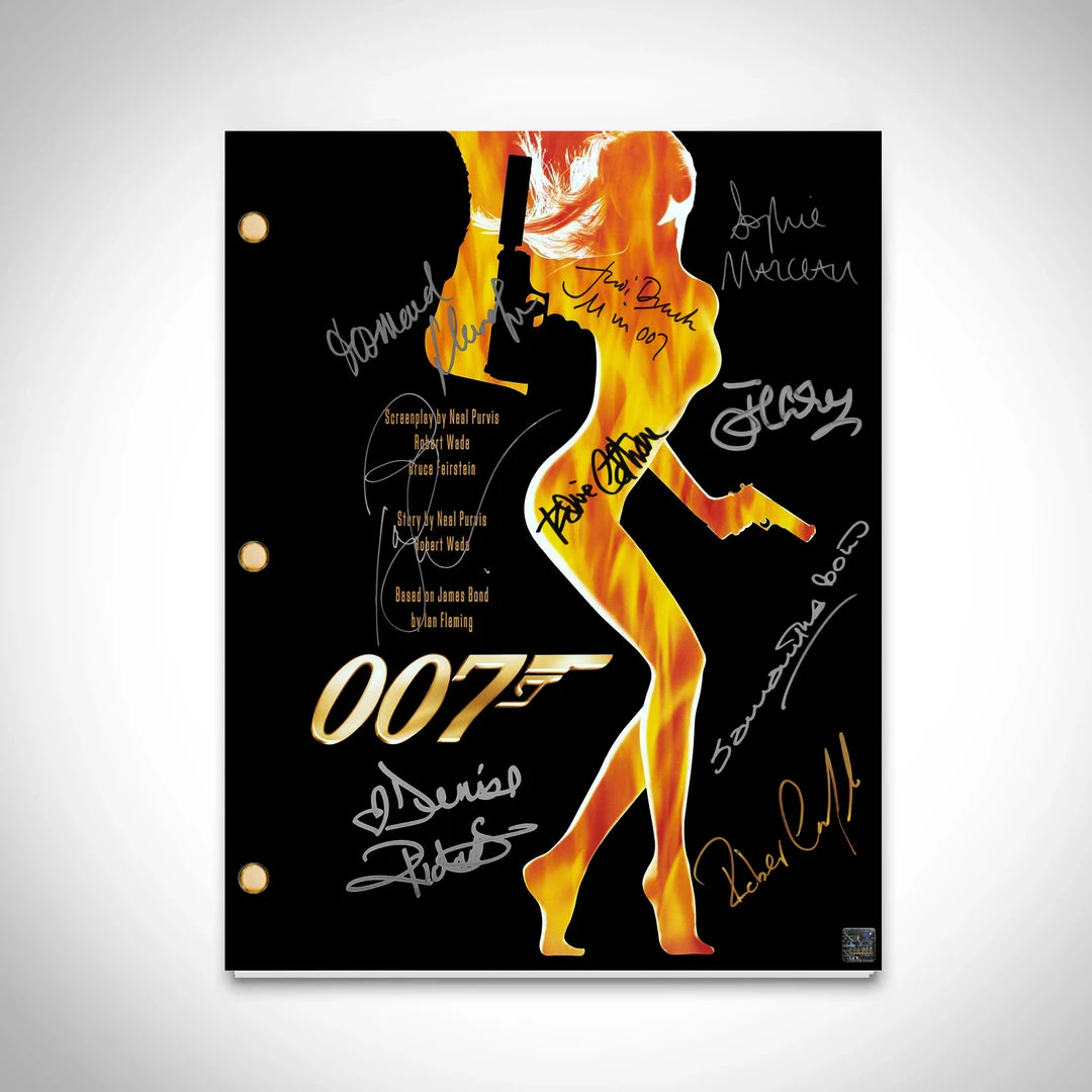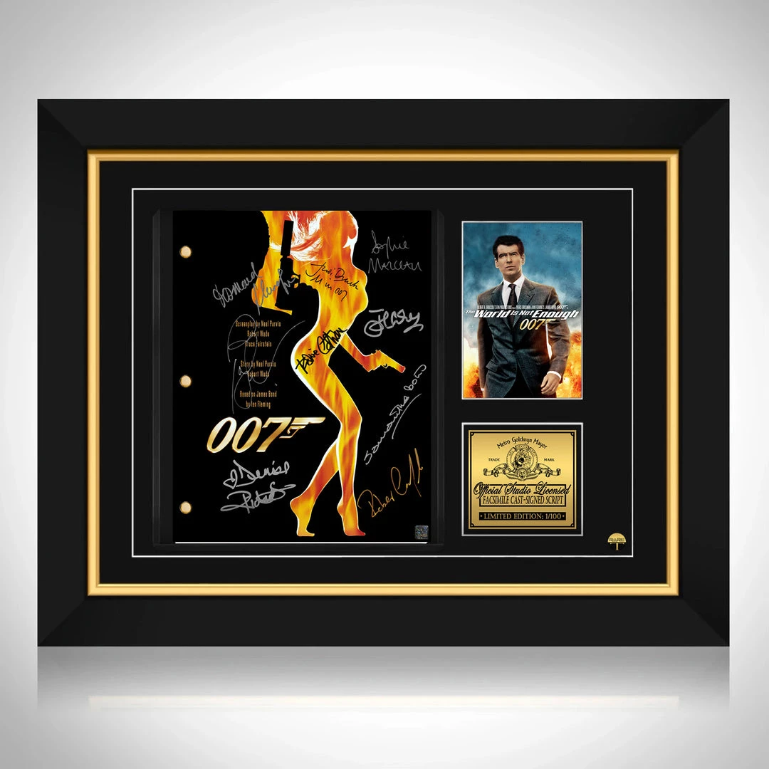 Pay homage to James Bond The World is not enough , with this MGM Studios fully licensed facsimile of the official signed movie script, originally signed by actors Pierce Brosnan, Sophie Marceau, Robert Carlyle, Denise Richards, Robbie Coltrane, Judi Dench, Desmond Llewelyn, John Cleese & Samatha Bond , of which is strictly limited to 100 units Worldwide and has been approved and numbered accordingly.