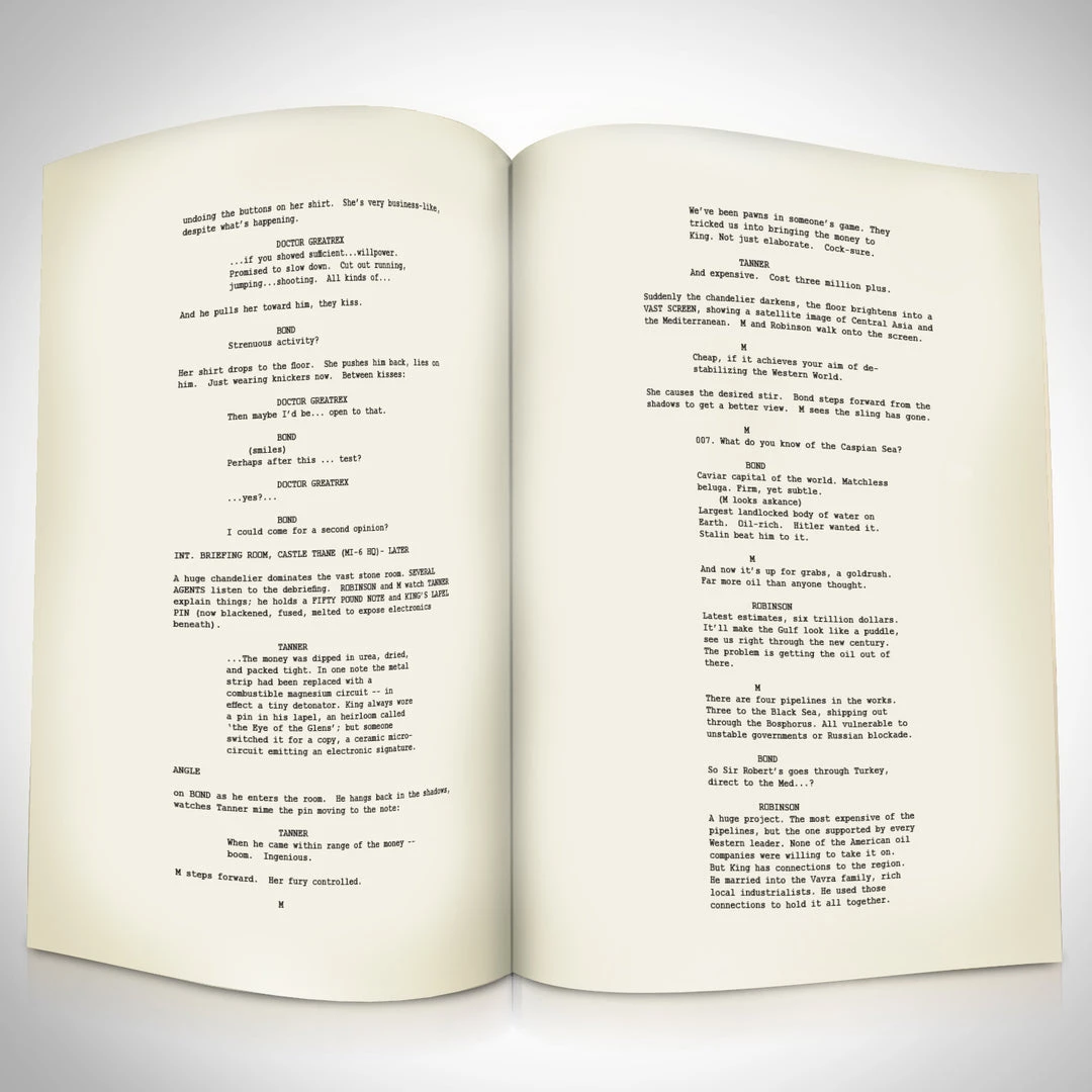 — Collector Grade Proprietary Exclusive VELVET TOUCH water/scratch resistant cover. — Collectible Facsimile of Original Hand-Signed James Bond The World is not enough movie Script Custom Frame.
