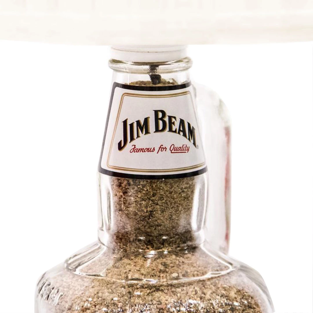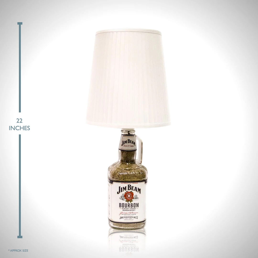 Folk Art, completely hand-crafted ‘JIM BEAM BOURBON WHISKEY’ 1.75 L Custom Bottle Lamp, filled with sand reproducing liquor color, with matching lampshade. An original and unique addition to your classy, modern, vintage or rustic style interior.
