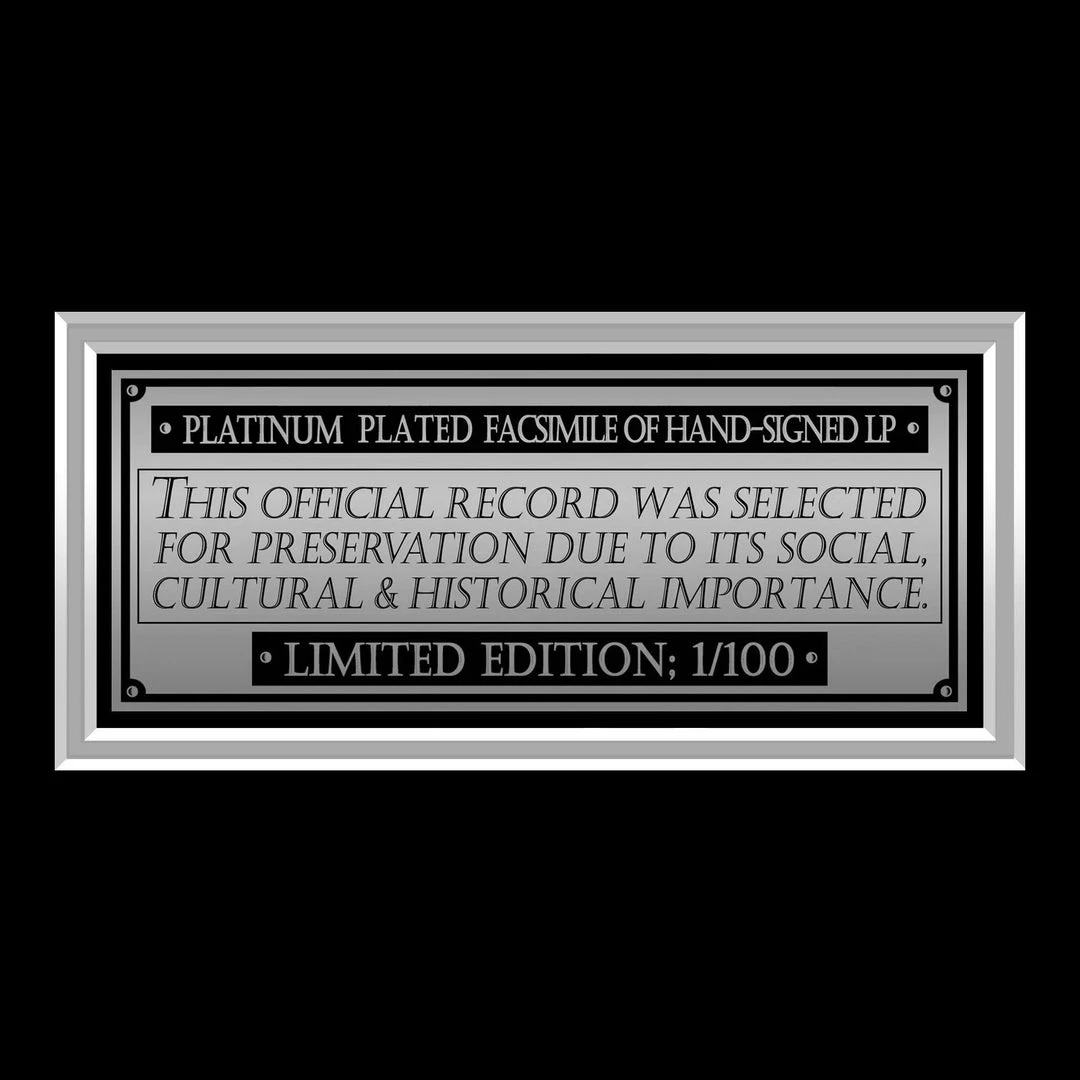 The Platinum Plated LP and album cover facsimile are both professionally mounted in the highest quality triple matted wood shadow box frame with metallic fillet trim and finished with protective glass to keep it looking pristine. The customized descriptive metallic plaque, in addition to the detailed finishing and openings, add to the elegant and sophisticated gallery quality look.