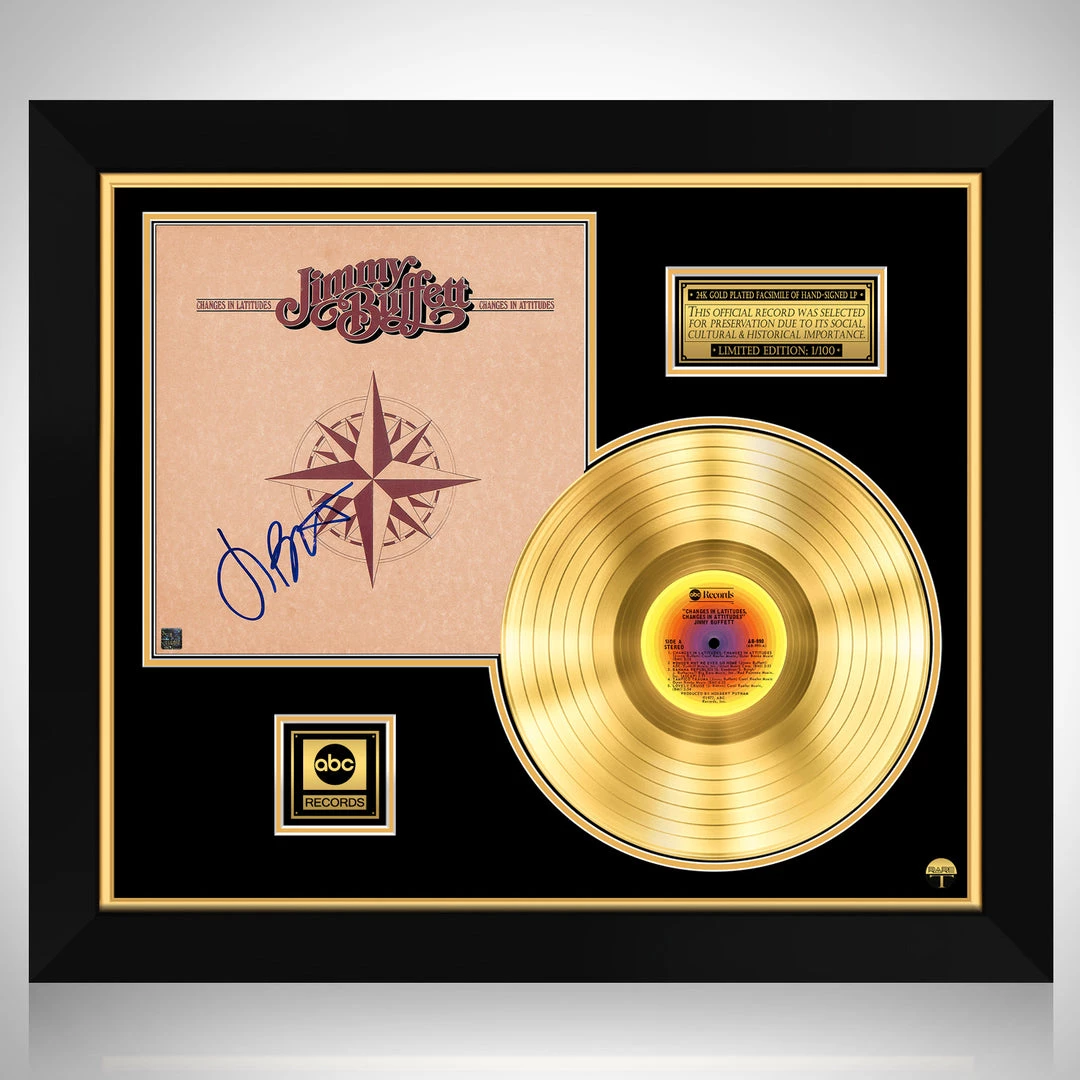 Pay homage to one of the most iconic American singer-songwriter, musician, author, actor of all time Jimmy Buffett , with this gallery-framed, authentic ABC Records fully licensed facsimile of the official Hand-Signed 24K Gold Plated LP Record and LP Cover Changes in latitudes, changes in attitude Originally signed by Jimmy Buffett , of which is strictly limited to 100 units Worldwide and has been approved and numbered accordingly.