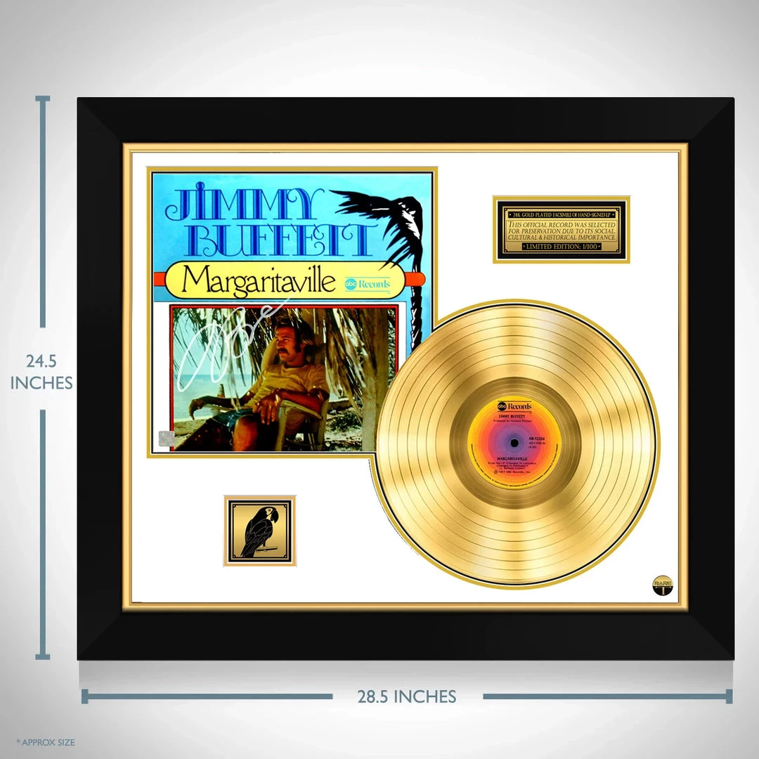 Pay homage to one of the best musical artists of all time, Jimmy Buffett, with this gallery-framed, authentic, abc Records fully licensed facsimile of the official Hand-Signed 24k Gold Plated LP Record and LP Cover Margaritaville from album Changes in Latitudes, Changes in Attitudes Originally signed by singer-songwriter, author, actor & guitarist, Jimmy Buffett, of which is strictly limited to 100 units Worldwide and has been approved and numbered accordingly.