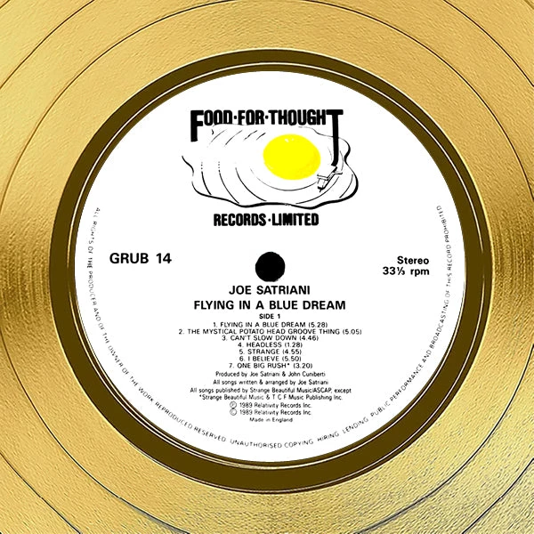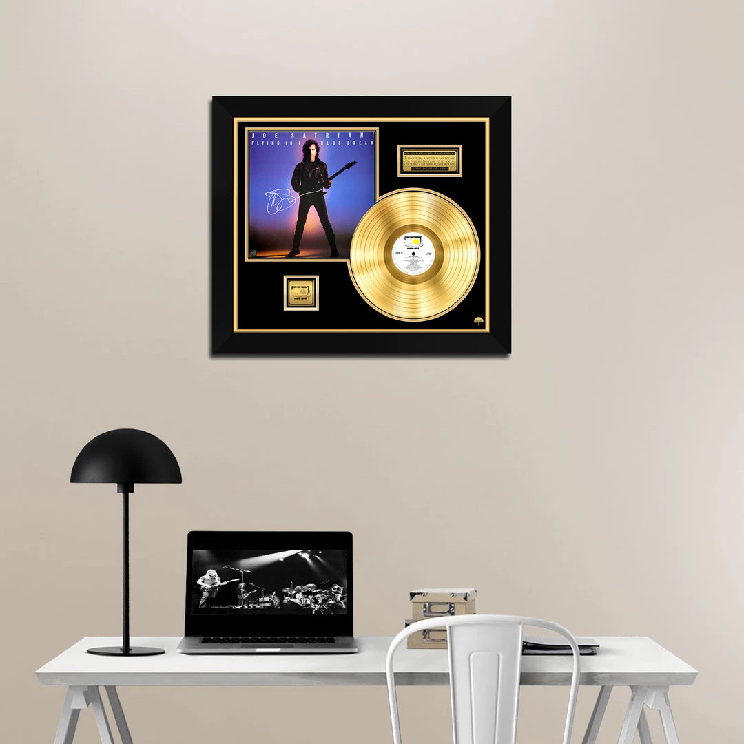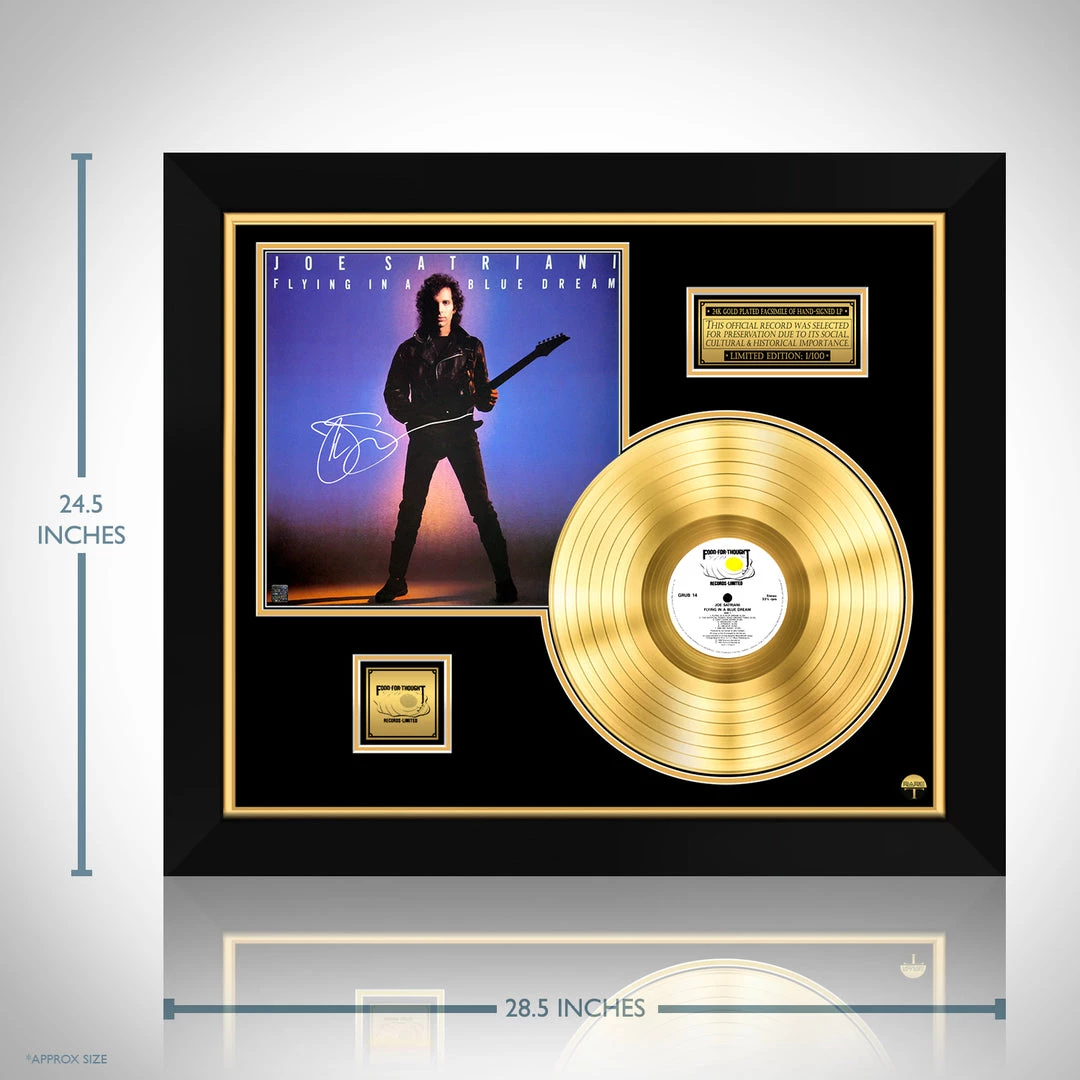 Pay homage to one of the most iconic American guitarist, composer, songwriter of all time Joe Satriani , with this gallery-framed, authentic Food for Thought Records fully licensed facsimile of the official Hand-Signed 24K Gold LP Record and LP Cover Flying in a Blue dream Originally signed by Joe Satriani , of which is strictly limited to 100 units Worldwide and has been approved and numbered accordingly.