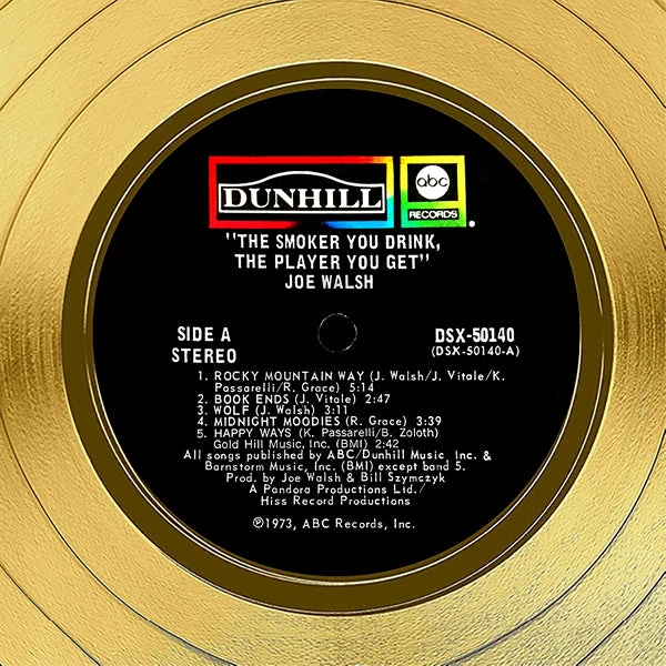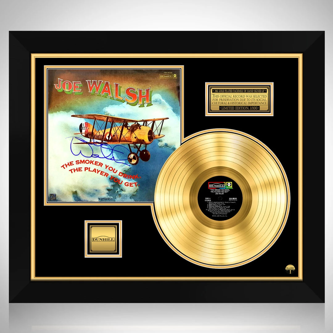 Pay homage to one of the most iconic American rock guitarist, singer, and songwriter of all time Joe Walsh , with this gallery-framed, authentic ABC Records fully licensed facsimile of the official Hand-Signed 24K Gold LP Record and LP Cover the smoker you drink, the player you get Originally signed by Joe Walsh , of which is strictly limited to 100 units Worldwide and has been approved and numbered accordingly.
