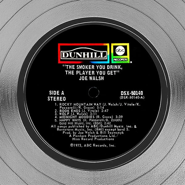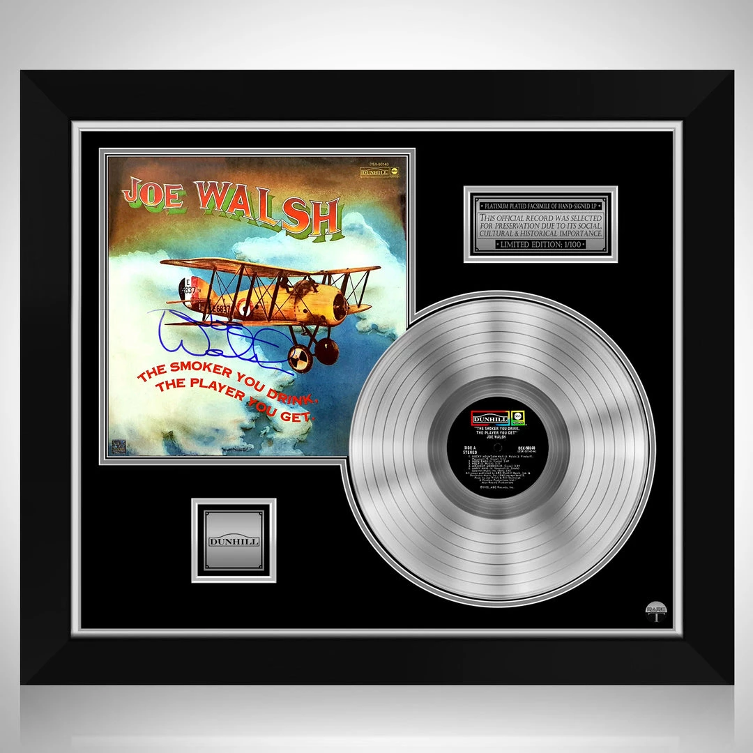 Pay homage to one of the most iconic American rock guitarist, singer, and songwriter of all time Joe Walsh , with this gallery-framed, authentic ABC Records fully licensed facsimile of the official Hand-Signed Platinum Plated LP Record and LP Cover the smoker you drink, the player you get Originally signed by Joe Walsh , of which is strictly limited to 100 units Worldwide and has been approved and numbered accordingly.