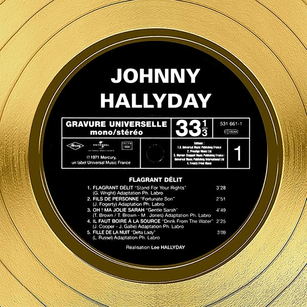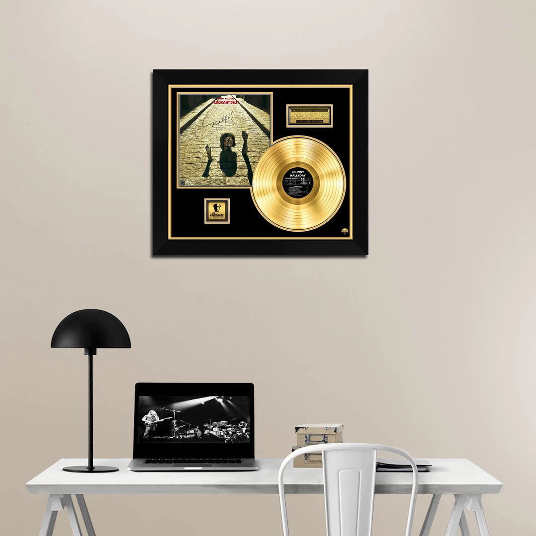 Pay homage to one of the most iconic adult movie of all time Johnny Hallyday , with this gallery-framed, authentic Mercury Records fully licensed facsimile of the official Hand-Signed 24K Gold LP Record and LP Cover Flagrant Délit Originally signed by Johnny Hallyday , of which is strictly limited to 100 units Worldwide and has been approved and numbered accordingly.