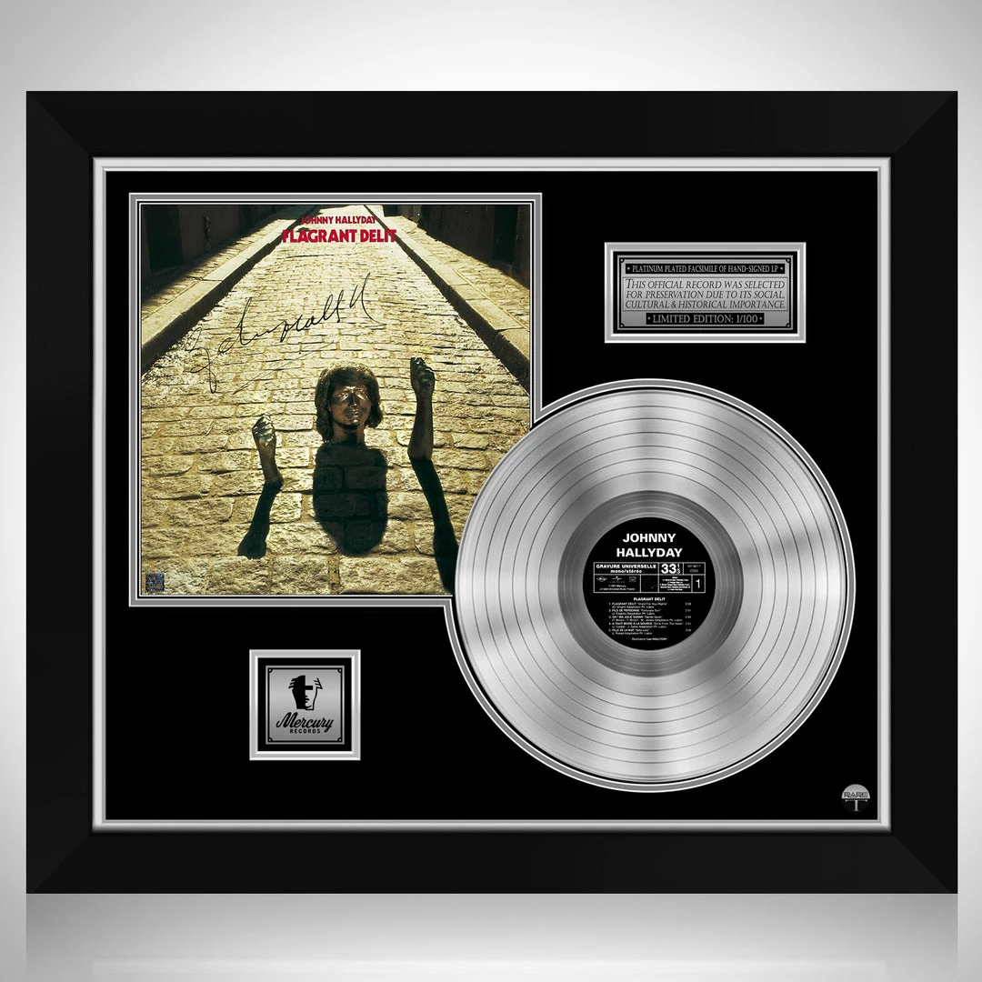 Pay homage to one of the most iconic adult movie of all time Johnny Hallyday , with this gallery-framed, authentic Mercury Records fully licensed facsimile of the official Hand-Signed Platinum Plated LP Record and LP Cover Flagrant Délit Originally signed by Johnny Hallyday , of which is strictly limited to 100 units Worldwide and has been approved and numbered accordingly.