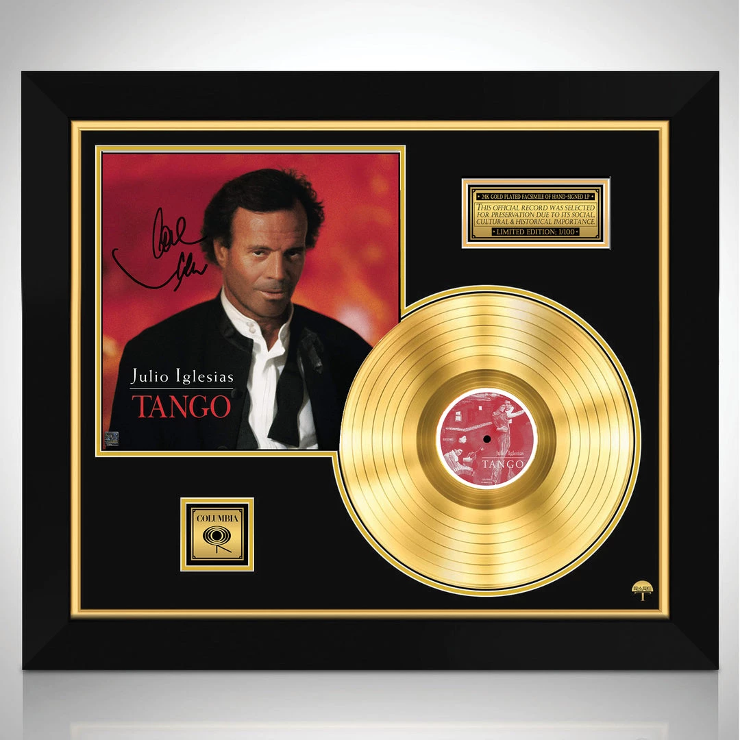 Pay homage to one of the most iconic singer of all time Julio Iglesias , with this gallery-framed, authentic Columbia Records fully licensed facsimile of the official Hand-Signed 24K Gold LP Record and LP Cover Tango Originally signed by Julio Iglesias , of which is strictly limited to 100 units Worldwide and has been approved and numbered accordingly.