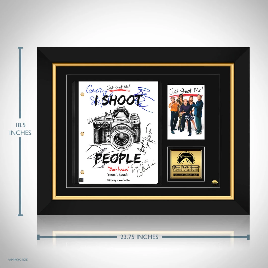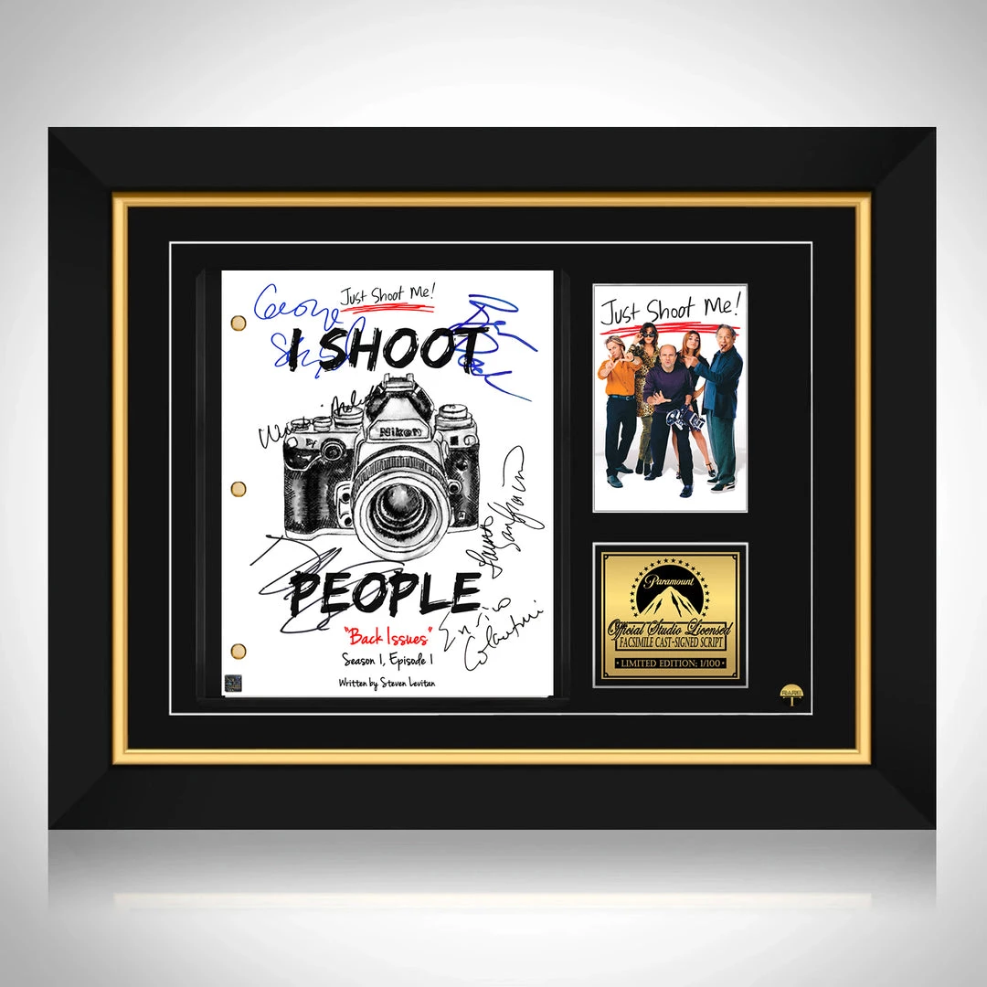 Pay homage to Just Shoot Me! , with this NBC fully licensed facsimile of the official signed TV Series Transcript , originally signed by actors Laura San Giacomo, George Segal, Wendie Malick, Enrico Colantoni, David Spade & Brian Posehn , of which is strictly limited to 100 units Worldwide and has been approved and numbered accordingly.