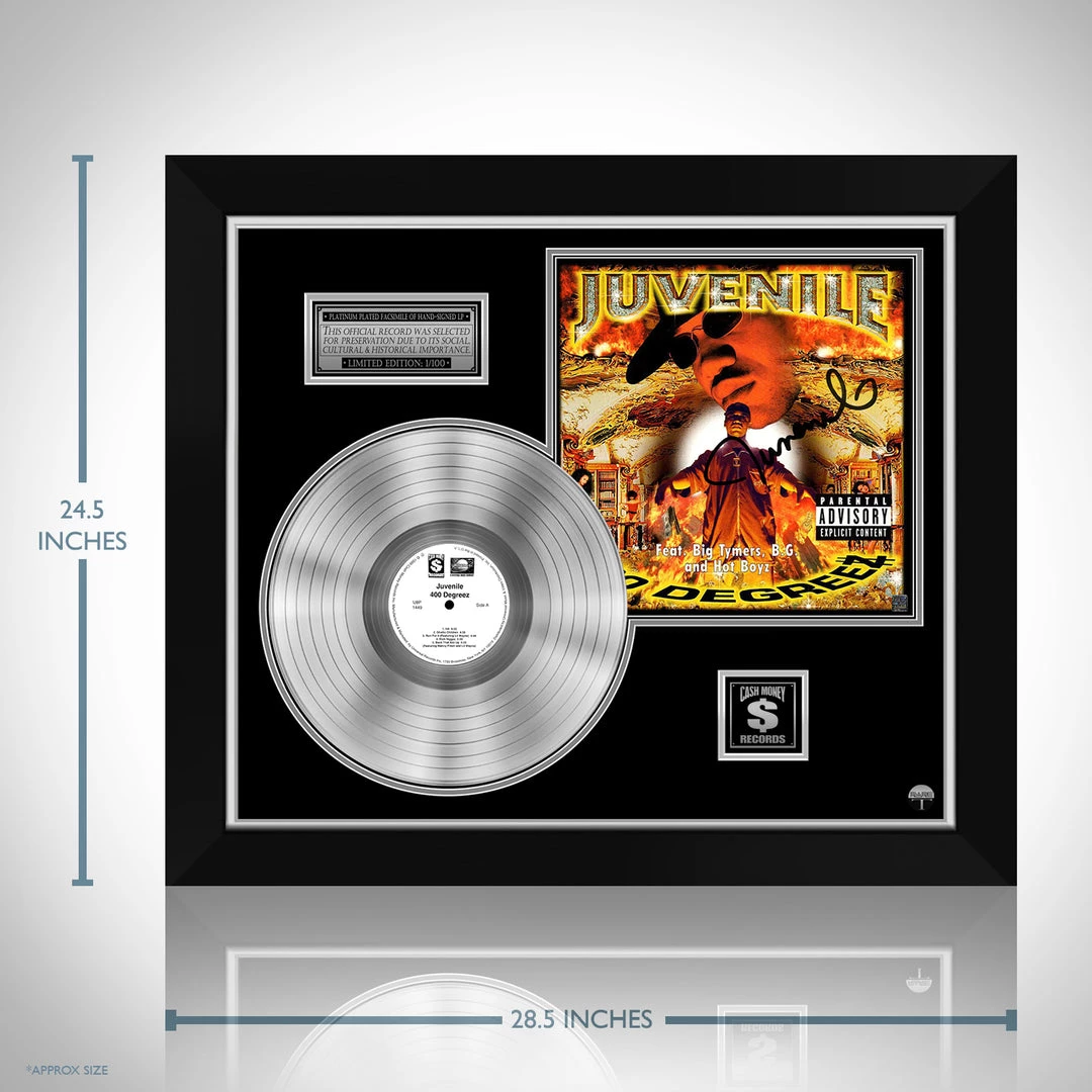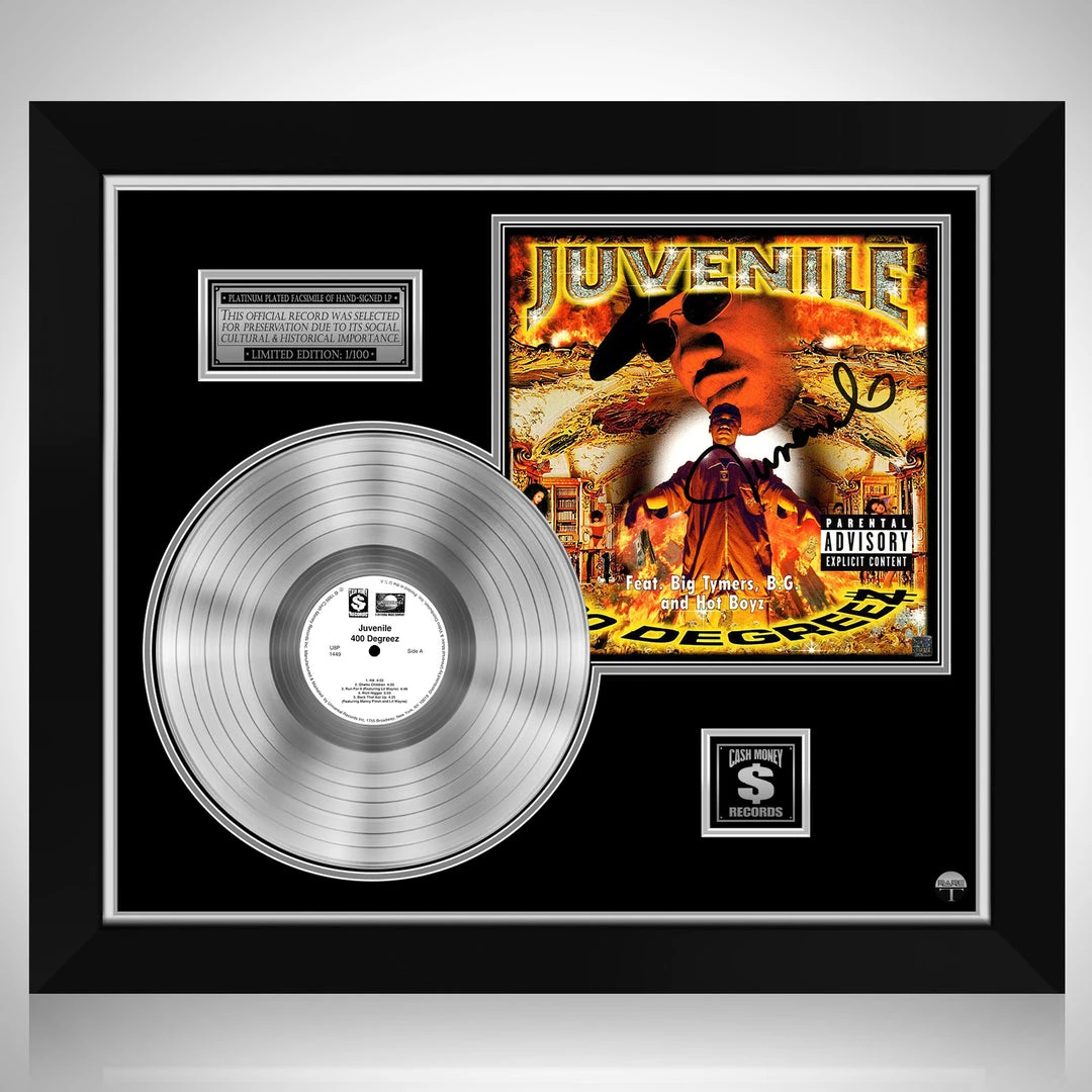 Pay homage to one of the most iconic American rapper of all time Juvenile , with this gallery-framed, authentic Cash Money records fully licensed facsimile of the official Hand-Signed Platinum Plated LP Record and LP Cover 400 Degreez Originally signed by Juvenile , of which is strictly limited to 100 units Worldwide and has been approved and numbered accordingly.
