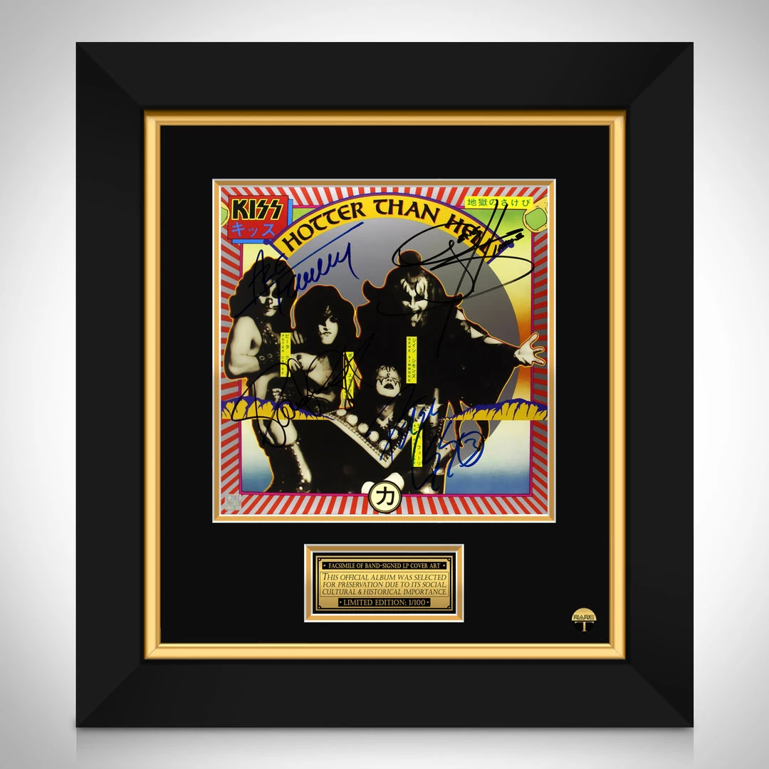 Pay homage to America’s #1 Gold record award-winning group of all time, KISS, with this gallery-framed, officially licensed, limited edition facsimile of the Hand-Signed, Hotter Than Hell LP Cover originally signed by Paul Stanley, Ace Frehley, Peter Criss & Gene Simmons, of which is strictly limited to 100 units Worldwide, and has been approved and numbered accordingly.