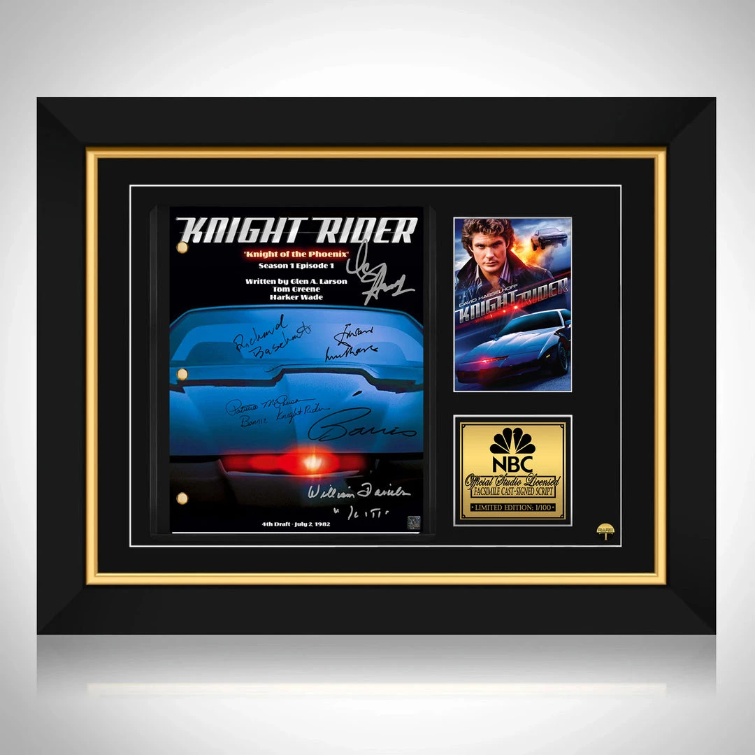 Pay homage to Knight Rider 1982 , with this NBC fully licensed facsimile of the official signed TV Series script, originally signed by actors David Hasselhoff, Edward Mulhare, Richard Basehart, Patricia McPherson, William Daniels & George Barris , of which is strictly limited to 100 units Worldwide and has been approved and numbered accordingly.