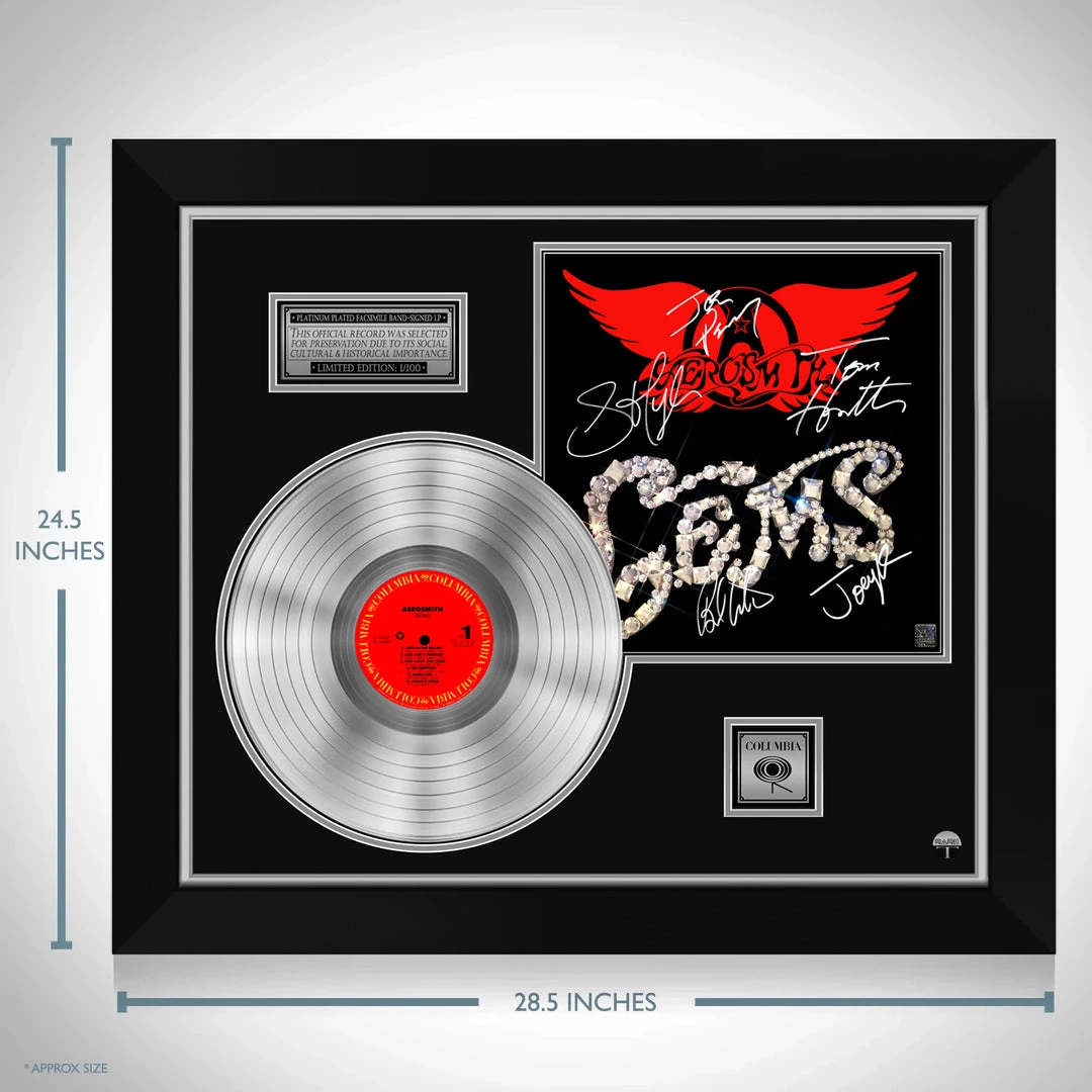 Pay homage to one of the world’s best selling and most influential rock bands of all time, Aerosmith, with this gallery-framed, authentic, Columbia Records fully licensed facsimile of the official Hand-Signed Platinum Plated LP Record and LP Cover ‘Gems‘ Originally signed by band members such as Joe Perry, Joey Kramer and Steven Tyler, of which is strictly limited to 100 units Worldwide and has been approved and numbered accordingly.