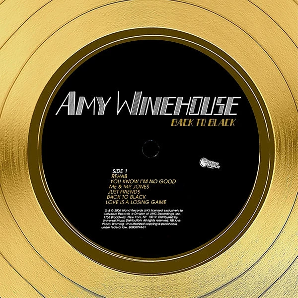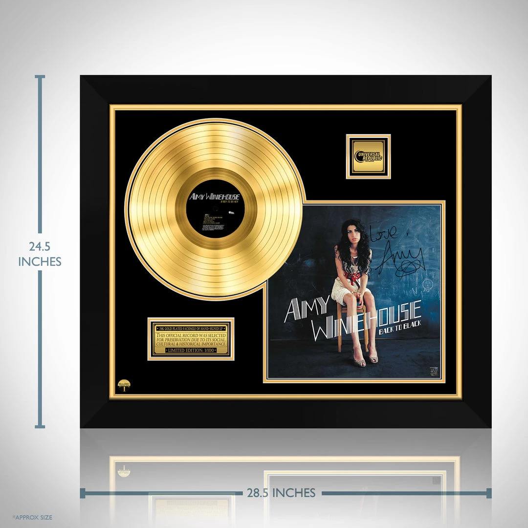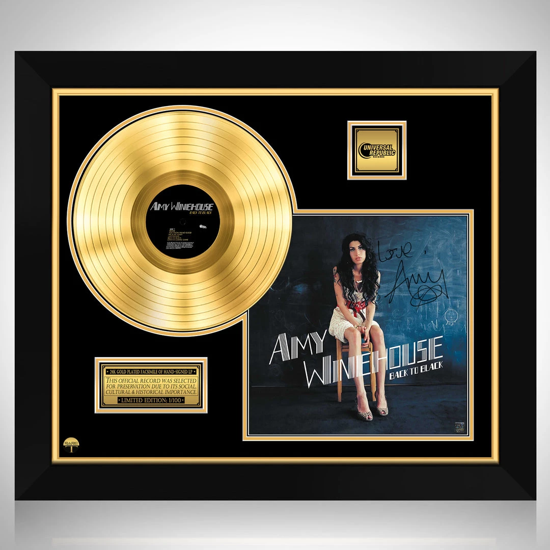 Pay homage to one of the most iconic English singer and songwriter of all time Amy Winehouse , with this gallery-framed, authentic Universal republic records fully licensed facsimile of the official Hand-Signed 24K Gold LP Record and LP Cover Back to Black Originally signed by Amy Winehouse , of which is strictly limited to 100 units Worldwide and has been approved and numbered accordingly.