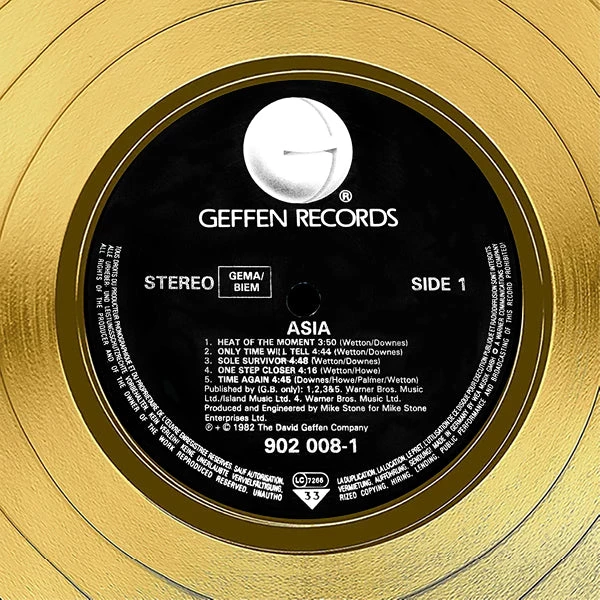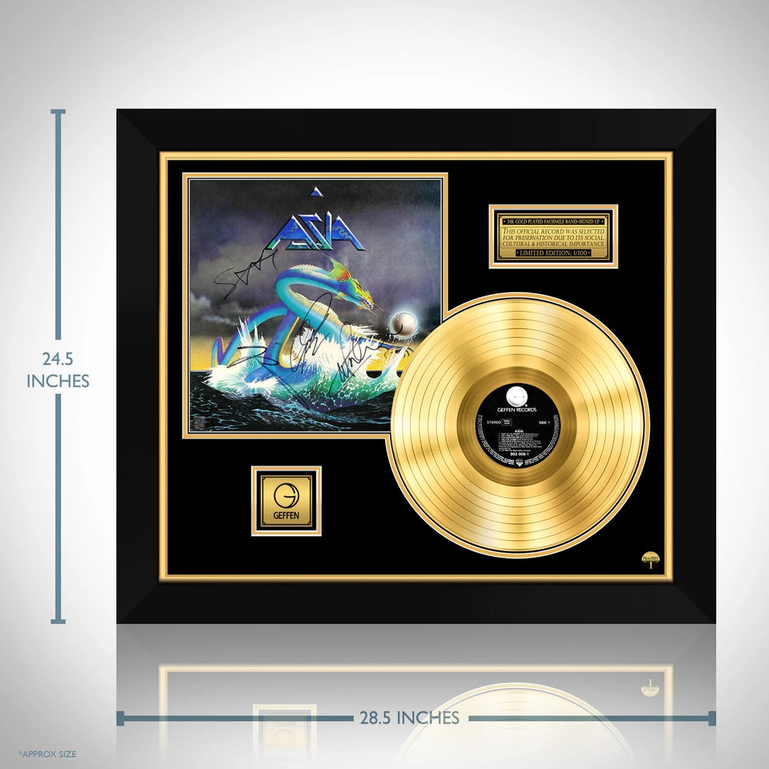 Pay homage to one of the most iconic English rock supergroup of all time Asia , with this gallery-framed, authentic Geffen Records fully licensed facsimile of the official Hand-Signed 24K Gold LP Record and LP Cover Asia Originally signed by John Wetton, Geoff Downes, Steve, Howe & Carl Palmer , of which is strictly limited to 100 units Worldwide and has been approved and numbered accordingly.