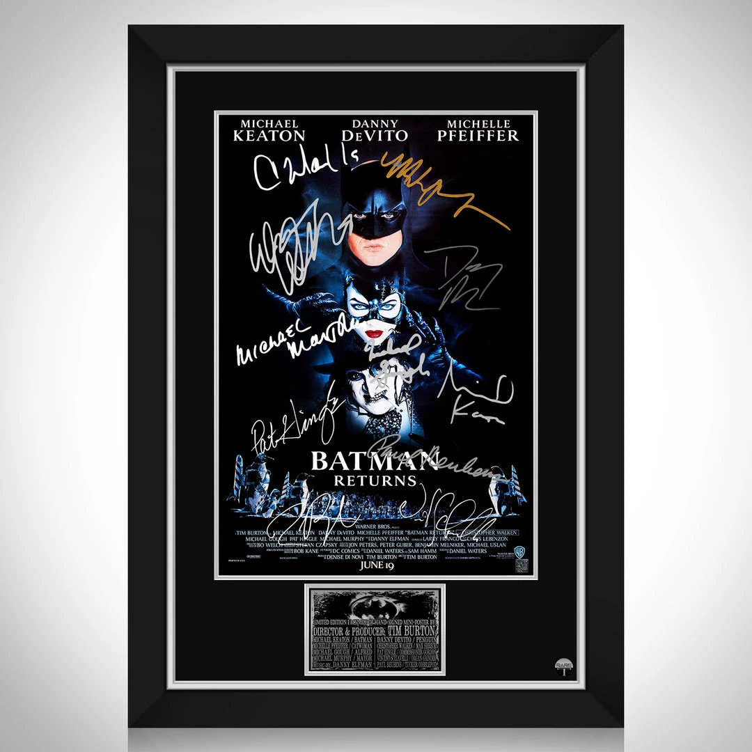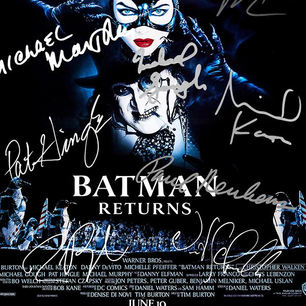 Pay homage to Batman Returns with this gallery-framed, officially licensed, limited edition facsimile of hand-signed mini poster, originally signed by Tim Burton, Michael Keaton, Michelle Pfeiffer, Michael Gough, Michael Murphy, Danny Devito, Christopher Walken, Pat Hingle, Vincent Schiavelli, Paul Reubens & Danny Elfman of which is strictly limited to 100 units Worldwide, and has been approved and numbered accordingly.