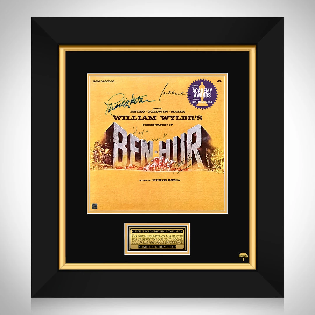 Pay homage to one of the most iconic movie of all time, Ben-Hur , with this gallery-framed, officially licensed, limited edition facsimile of the Hand-Signed Original Motion Picture Soundtrack LP Cover originally signed by Charlton Heston, Jack Hawkins, Haya Harareet & Stephen Boyd , of which is strictly limited to 100 units Worldwide, and has been approved and numbered accordingly.