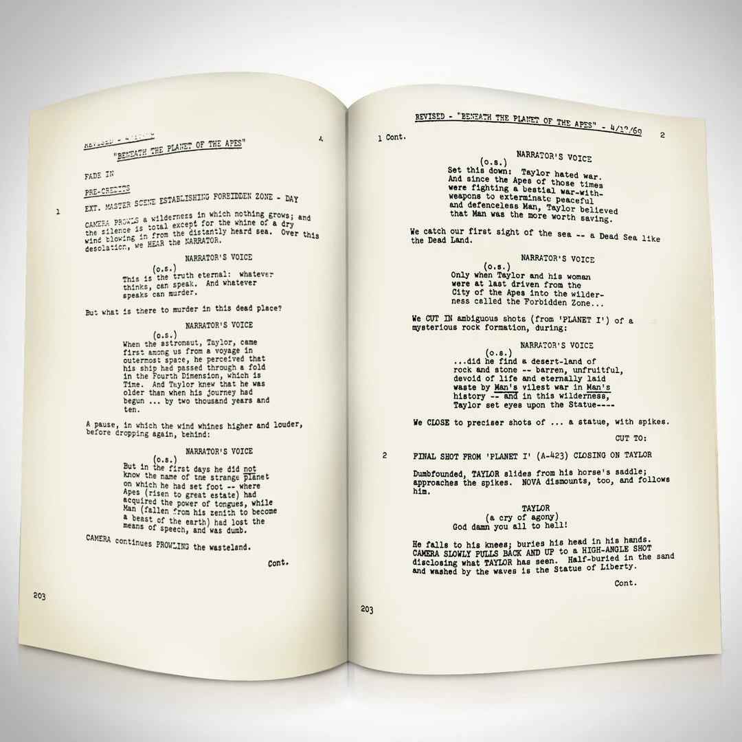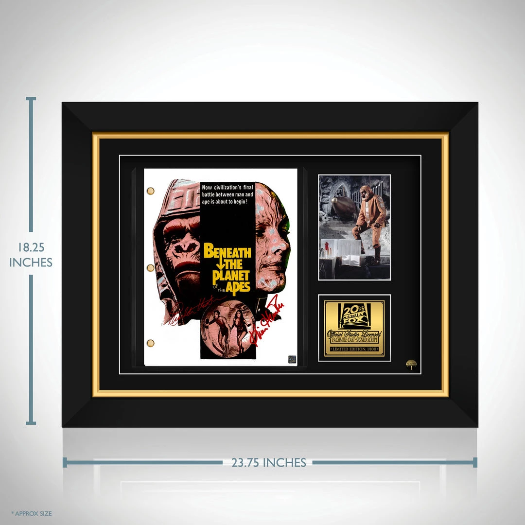 Pay homage to Beneath the Planet of the Apes , with this 20th Century Fox  fully licensed facsimile of the official signed movie script, originally signed by actors Charlton Heston, Kim Hunter & Linda Harrison , of which is strictly limited to 100 units Worldwide and has been approved and numbered accordingly.