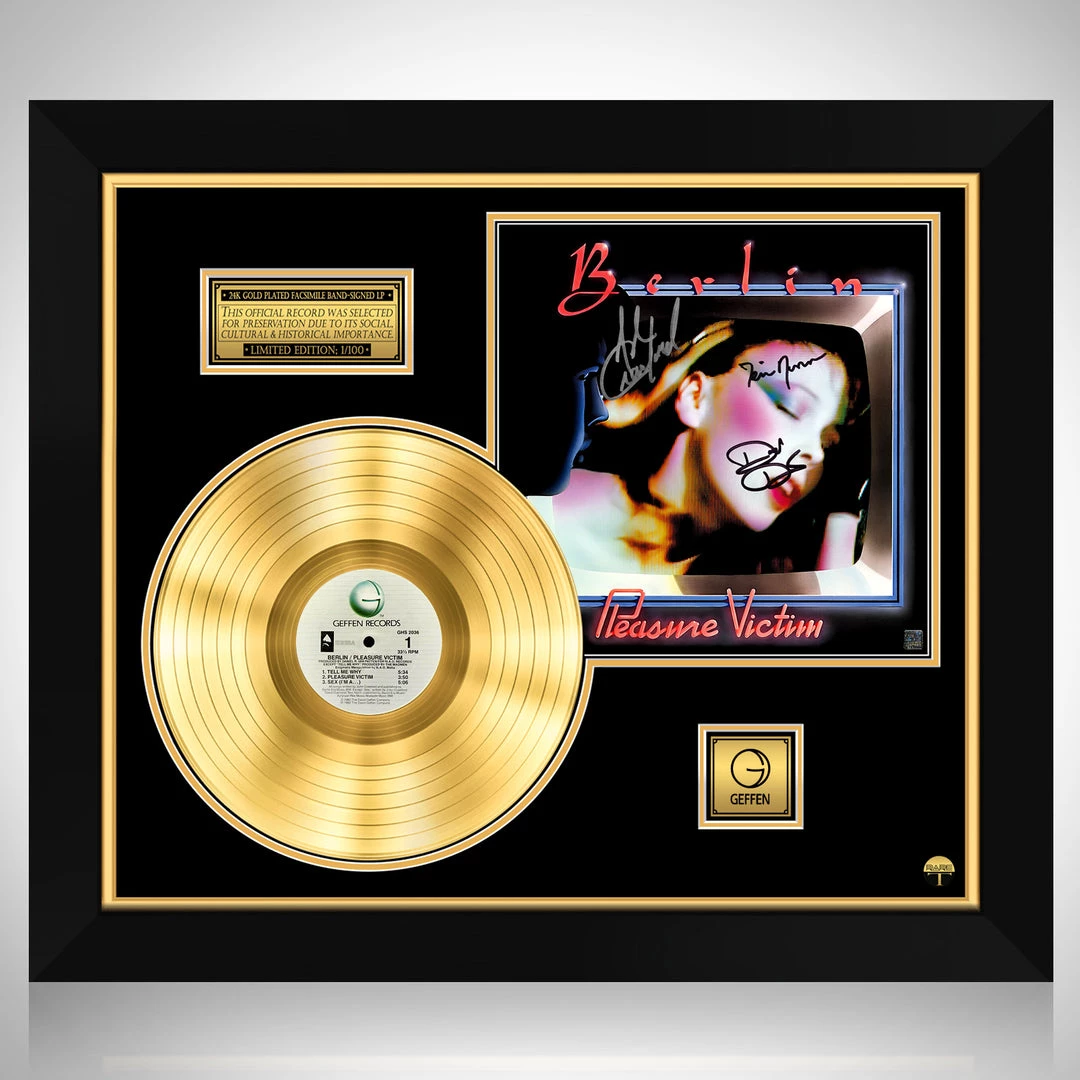 Pay homage to one of the most iconic American new wave band of all time Berlin , with this gallery-framed, authentic Geffen Records fully licensed facsimile of the official Hand-Signed 24K Gold LP Record and LP Cover Pleasure Originally signed by John Crawford, David Diamond & Terri Nunn , of which is strictly limited to 100 units Worldwide and has been approved and numbered accordingly.