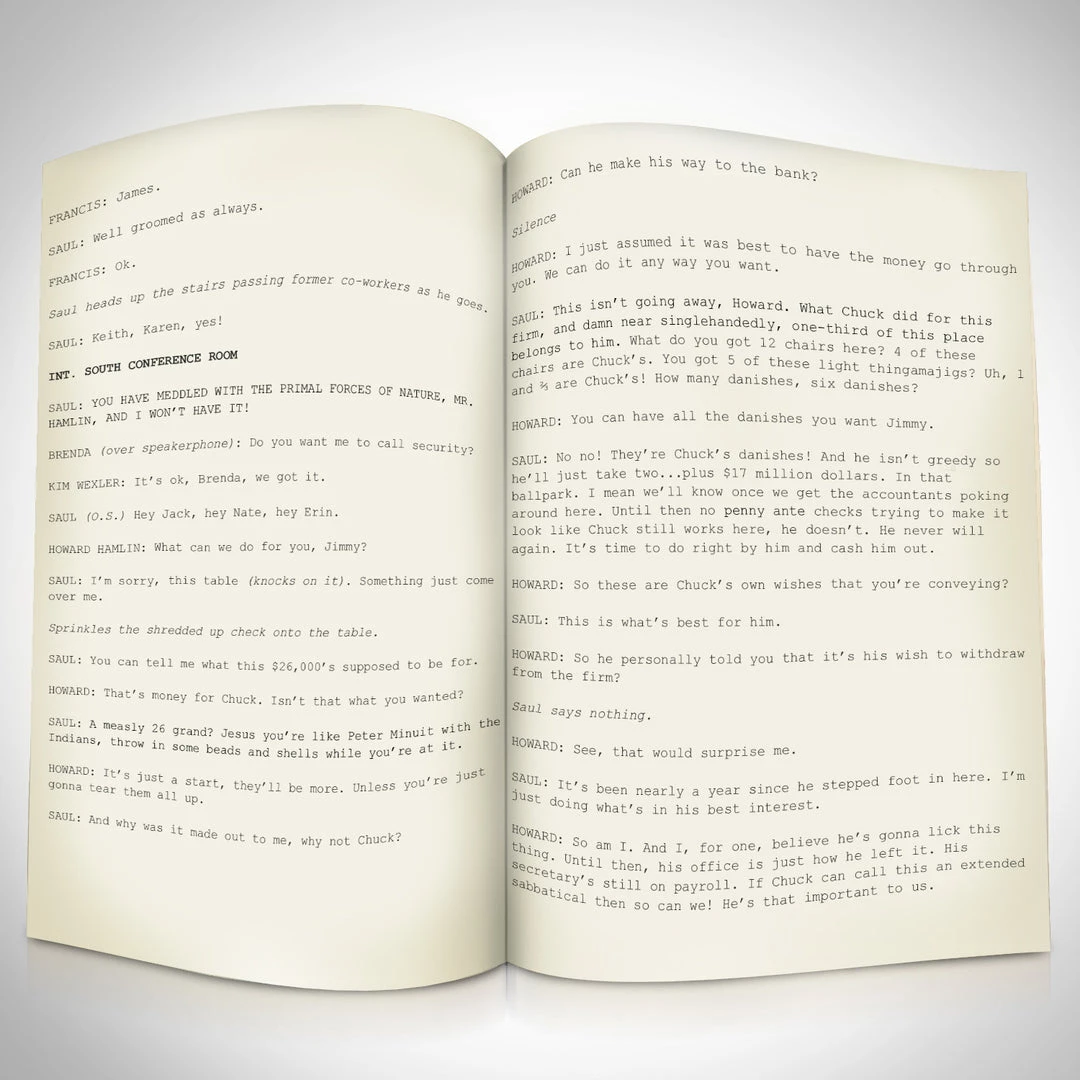 Pay homage to Better Call Saul , with this AMC Studios  fully licensed facsimile of the official signed TV Series script, originally signed by actors writer Bob Odenkirk, actor Jonathan Banks & actor and director Giancarlo Esposito , of which is strictly limited to 100 units Worldwide and has been approved and numbered accordingly.