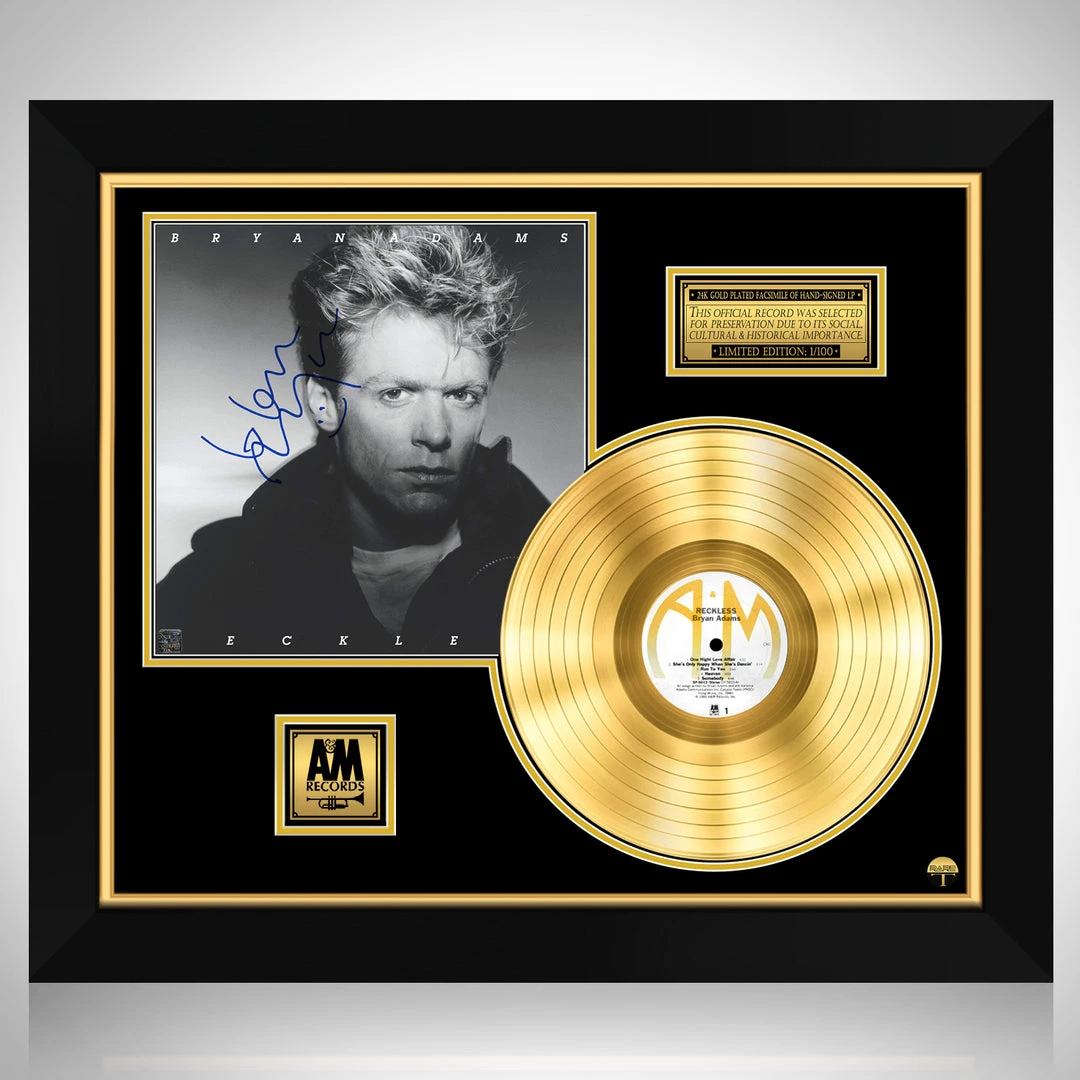 Pay homage to one of the most iconic musician of all time Bryan Adams , with this gallery-framed, authentic A&M Records fully licensed facsimile of the official Hand-Signed 24K Gold LP Record and LP Cover Reckless Originally signed by Bryan Adams , of which is strictly limited to 100 units Worldwide and has been approved and numbered accordingly.