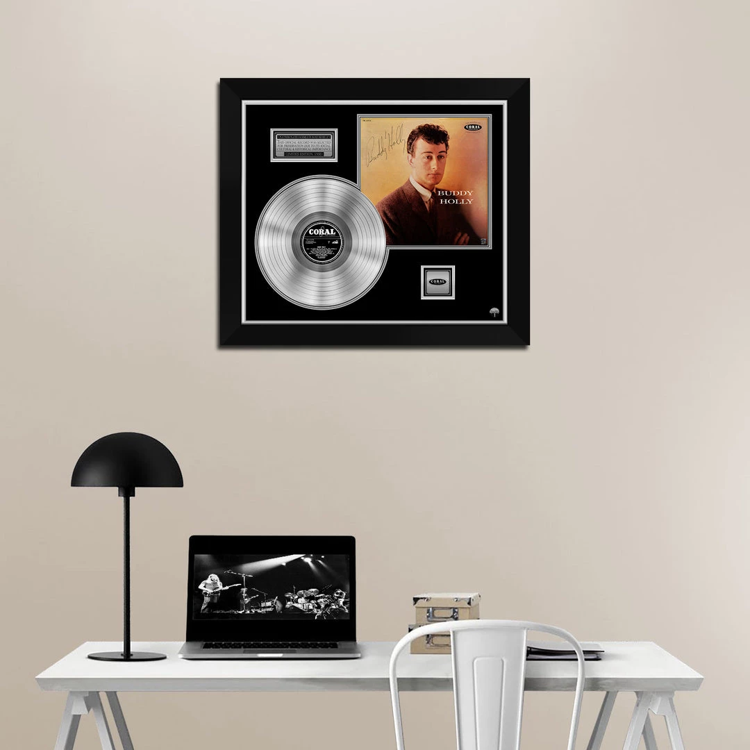 Pay homage to one of the most iconic American singer-songwriter of all time Buddy Holly , with this gallery-framed, authentic Coral Records fully licensed facsimile of the official Hand-Signed Platinum Plated LP Record and LP Cover Self-Titled Originally signed by Charles Hardin , of which is strictly limited to 100 units Worldwide and has been approved and numbered accordingly.