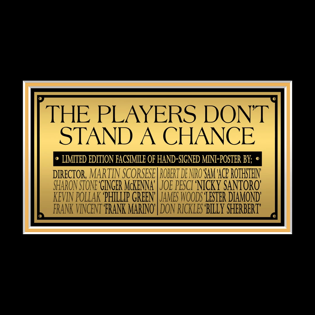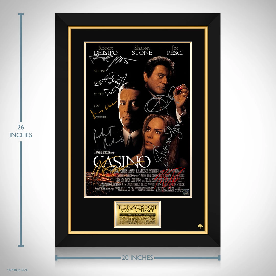 Pay homage to Casino with this gallery-framed, officially licensed, limited edition facsimile of hand-signed mini poster, originally signed by Martin Scorsese, Sharon Stone, Kevin Pollak, Frank Vincent, Robert De Niro, Joe Pesci, James Woods and Don Rickles, of which is strictly limited to 100 units Worldwide, and has been approved and numbered accordingly.