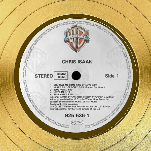 Pay homage to one of the most iconic musician of all time Chris Isaak , with this gallery-framed, authentic Warner Bros fully licensed facsimile of the official Hand-Signed 24K Gold LP Record and LP Cover Self titled Originally signed by Chris Isaak , of which is strictly limited to 100 units Worldwide and has been approved and numbered accordingly.