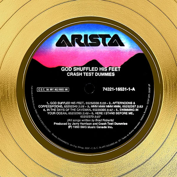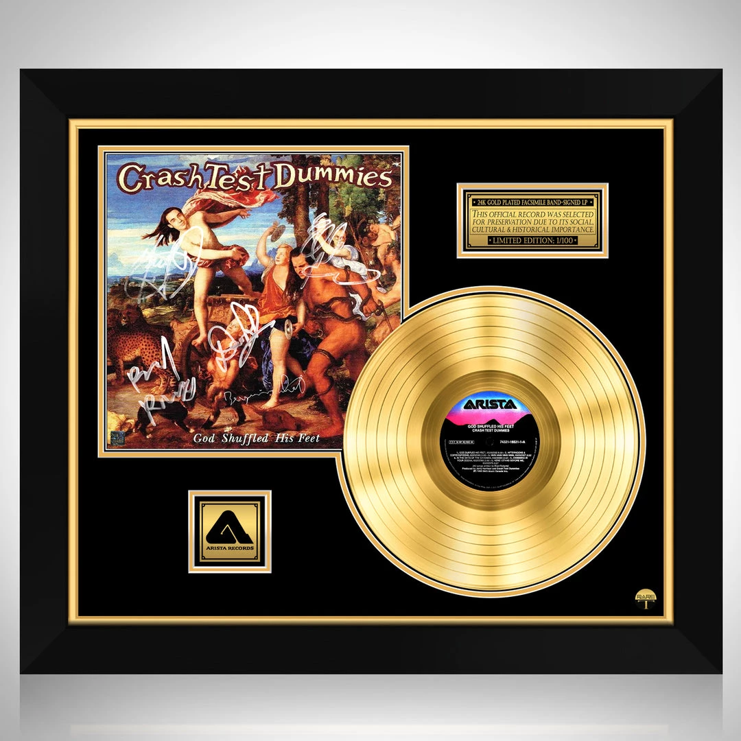 Pay homage to one of the most iconic Canadian rock band of all time Crash Test Dummies , with this gallery-framed, authentic Arista Records fully licensed facsimile of the official Hand-Signed 24K Gold LP Record and LP Cover God blessed his feet Originally signed by Benjamin Darvill, Brad Roberts, Dan Roberts, Michael Dorge & Ellen Reid , of which is strictly limited to 100 units Worldwide and has been approved and numbered accordingly.