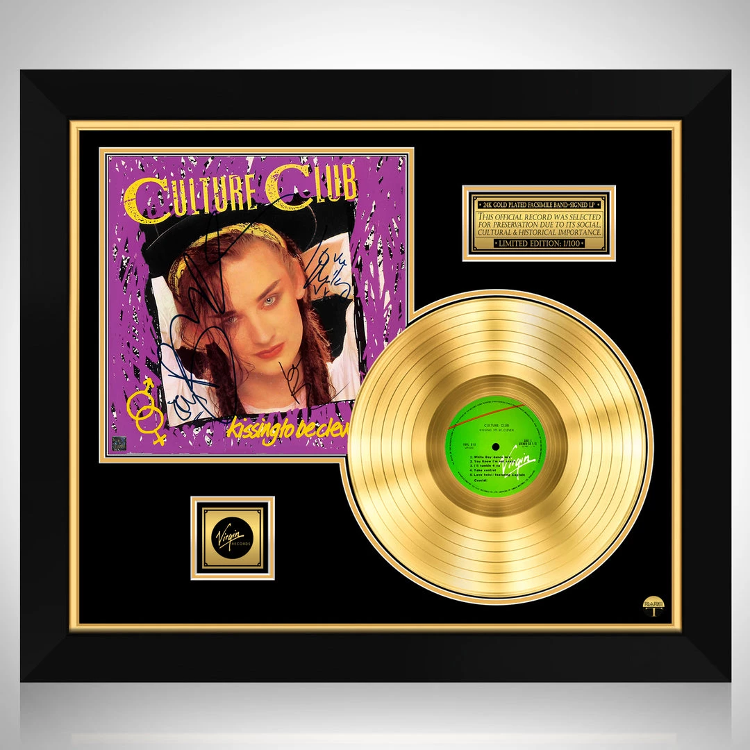 Pay homage to one of the most iconic band of all time Culture Club , with this gallery-framed, authentic Epic Records fully licensed facsimile of the official Hand-Signed 24K Gold Plated LP Record and LP Cover Kissing to be Clever Originally signed by Boy George, Michael Craig, Roy Hay & Jon Moss, of which is strictly limited to 100 units Worldwide and has been approved and numbered accordingly.