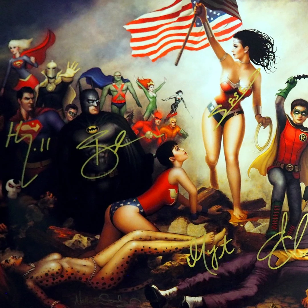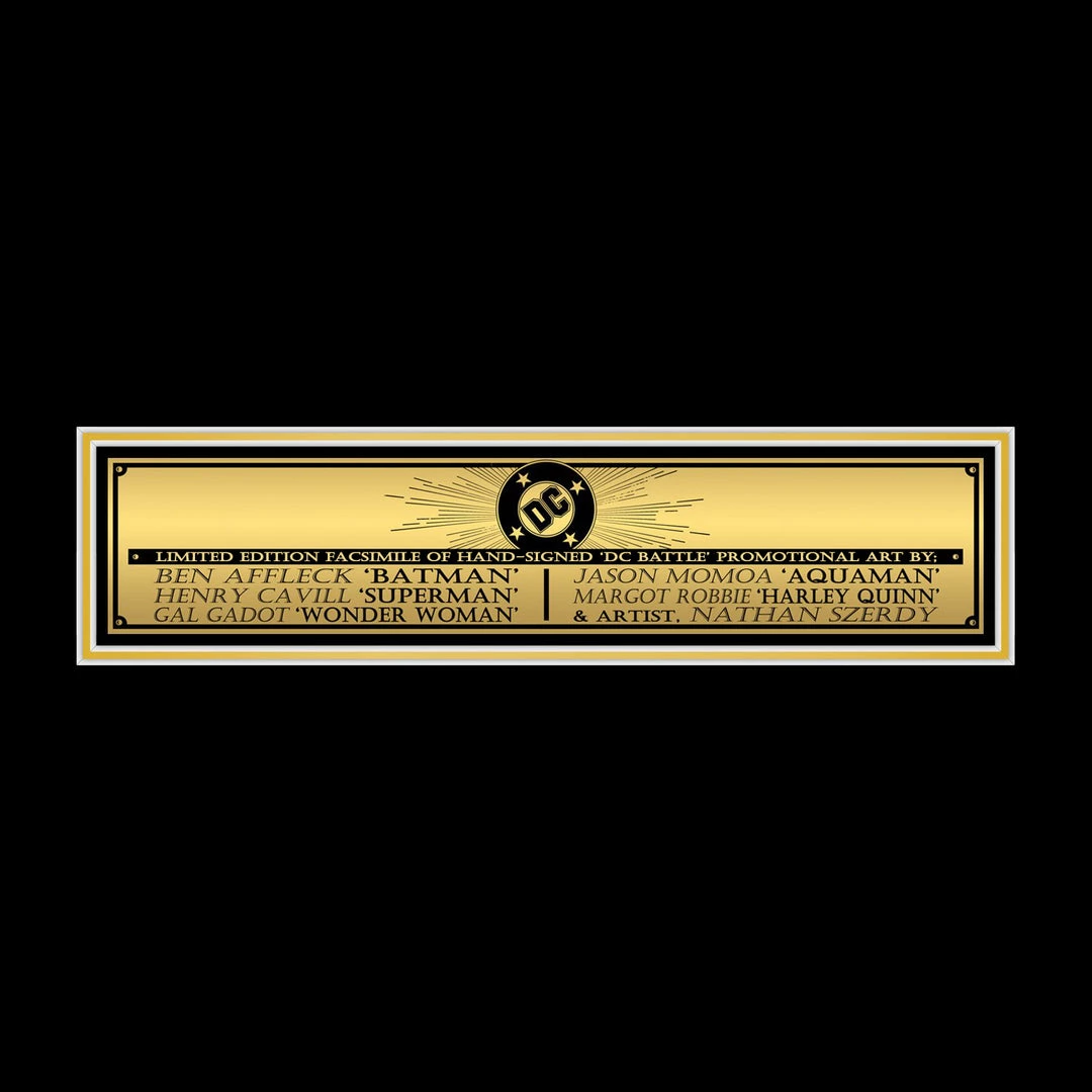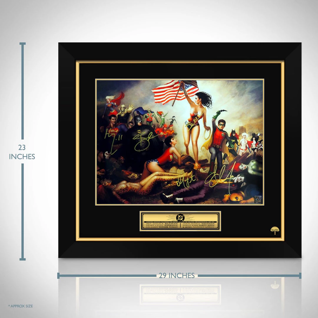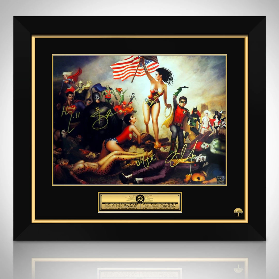 Pay homage to DC Comics with this gallery-framed, officially licensed, limited edition facsimile of the Hand-Signed art work, originally signed by Ben Affleck, Henry Cavill, Gal Gadot, Margot Robbie, Jason Mamoa and by famous artist Nathan Szerdy. of which is strictly limited to 100 units Worldwide, and has been approved and numbered accordingly.