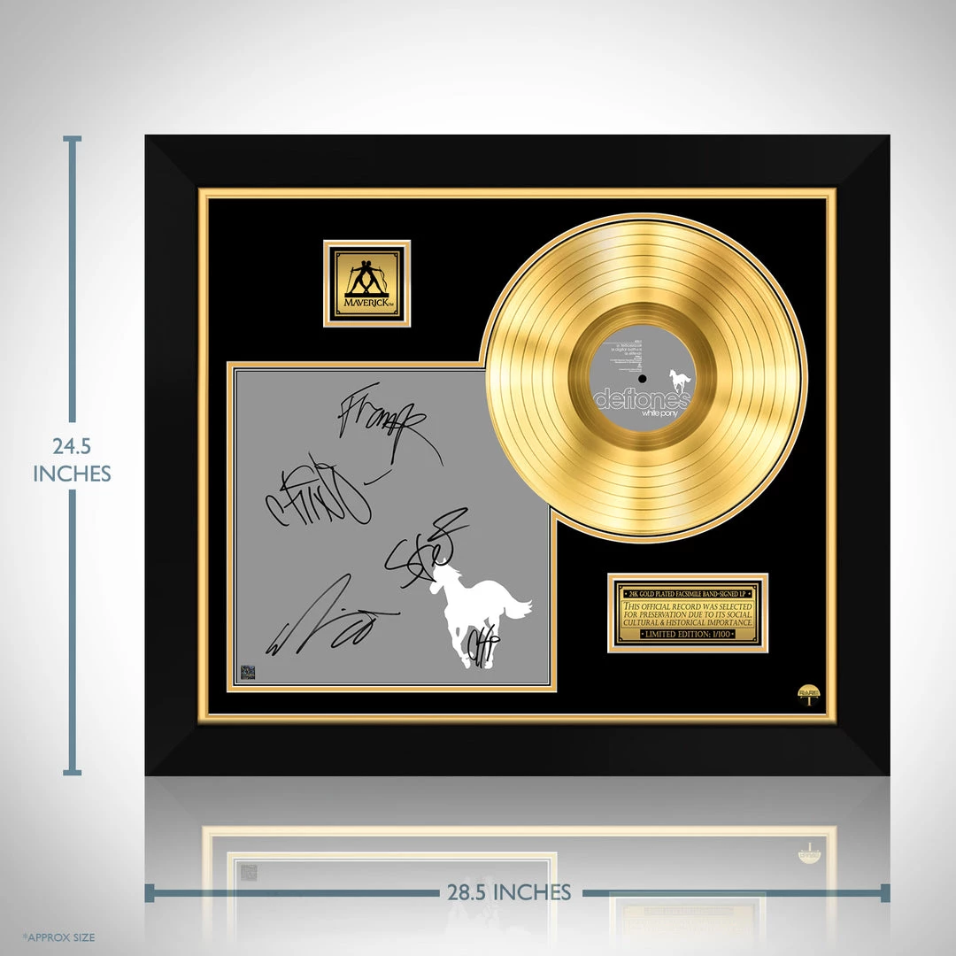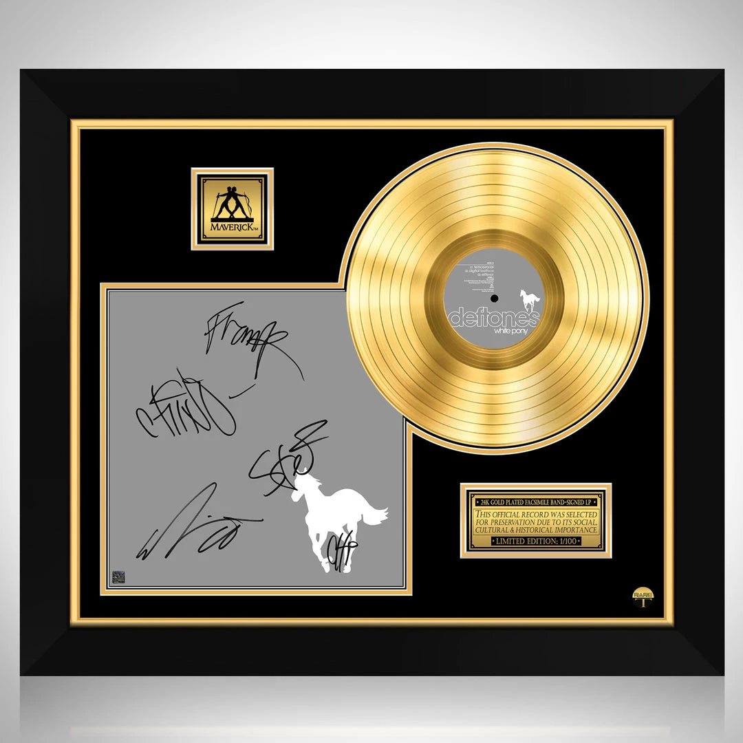 Pay homage to one of the most iconic American alternative metal band of all time Deftones , with this gallery-framed, authentic Maverick Records fully licensed facsimile of the official Hand-Signed 24K Gold LP Record and LP Cover White Pony Originally signed by Stephen Carpenter, Abe Cunningham, Chino Moreno, Frank Delgado & Chi Cheng , of which is strictly limited to 100 units Worldwide and has been approved and numbered accordingly.
