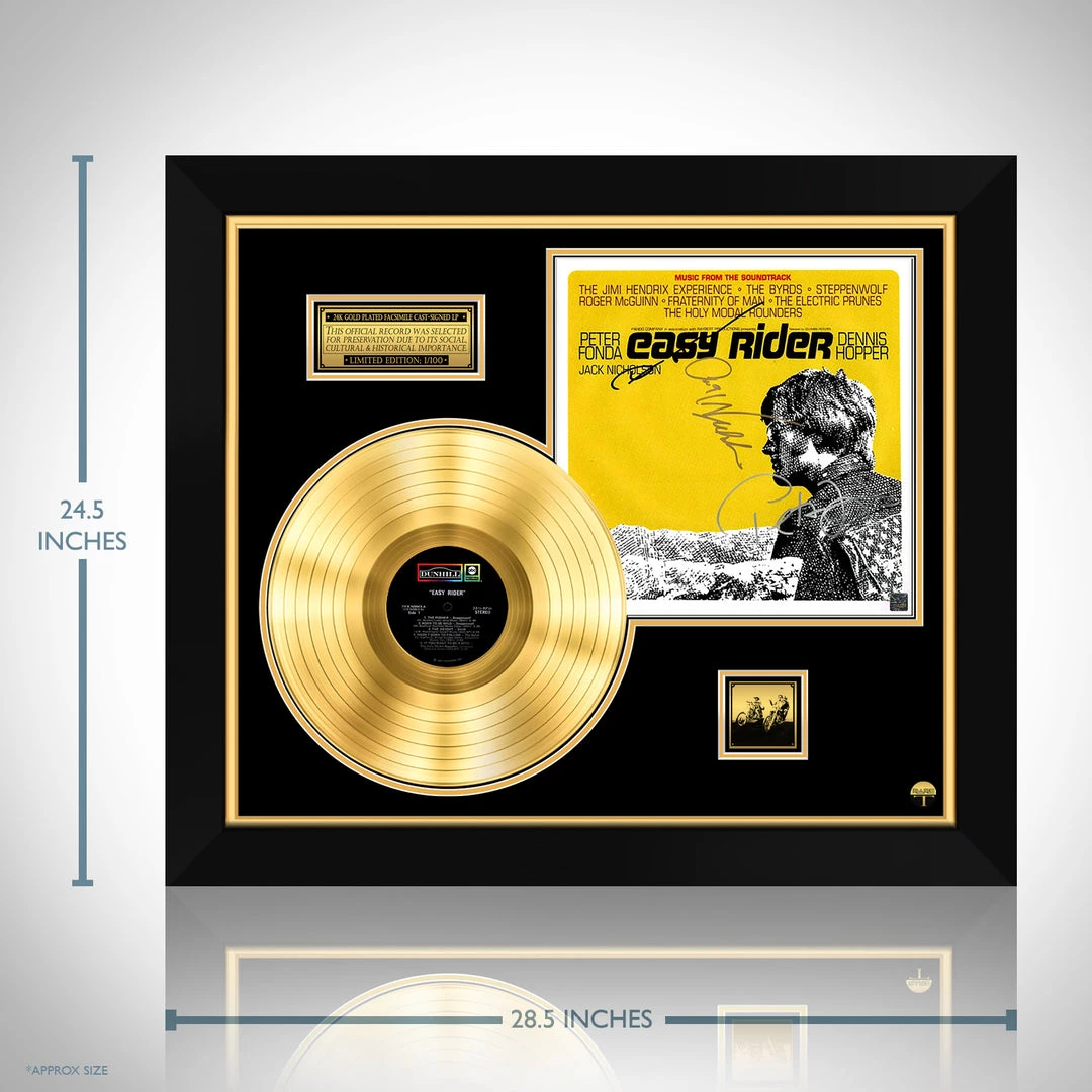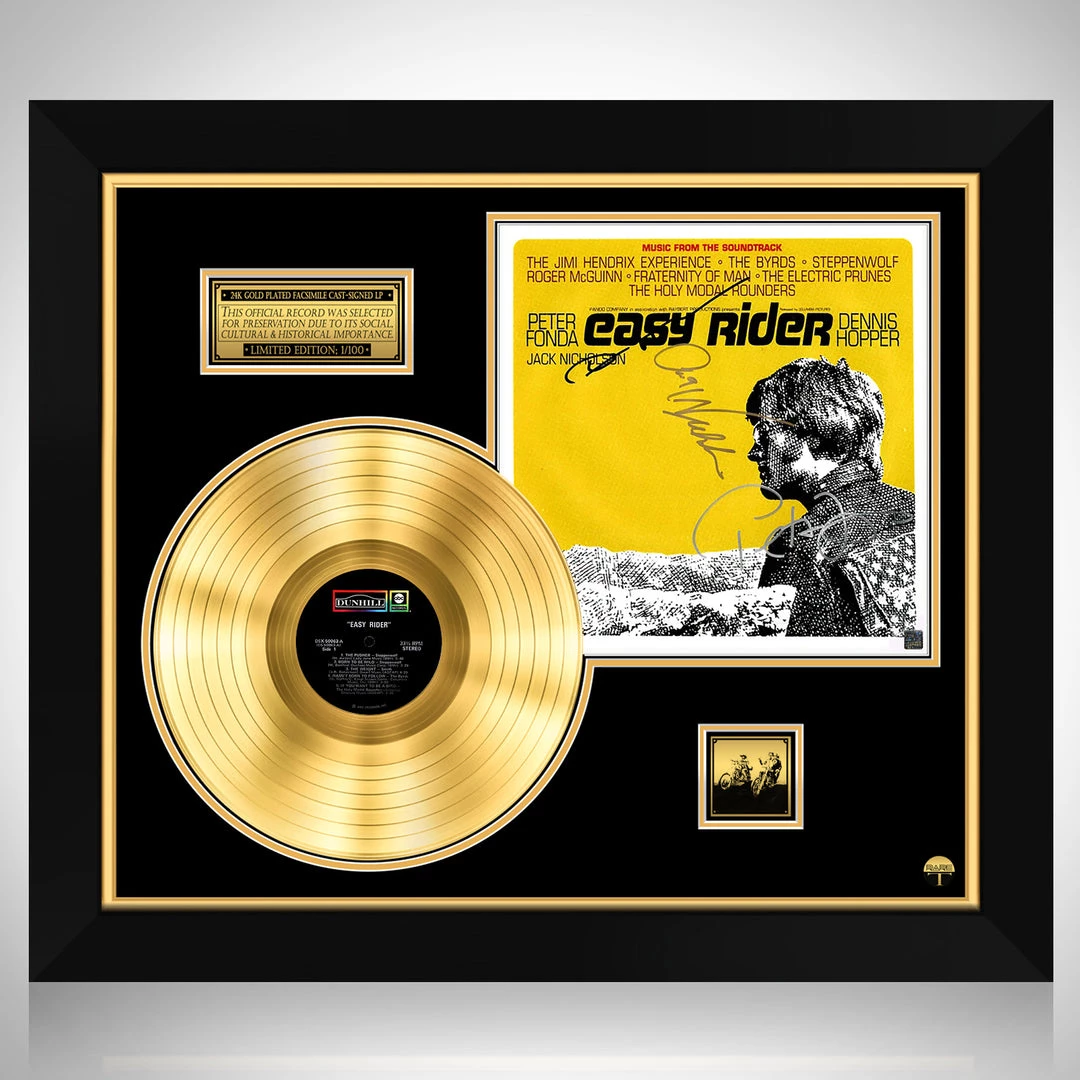 Pay homage to one of the most iconic movie of all time Easy Rider , with this gallery-framed, authentic Reprise records fully licensed facsimile of the official Hand-Signed 24K Gold LP Record and LP Cover Soundtrack Originally signed by filmmaker Jack Nicholson, writer, director & actor, the late great Dennis Hopper & writer, producer & actor, the late great Peter Fonda , of which is strictly limited to 100 units Worldwide and has been approved and numbered accordingly.