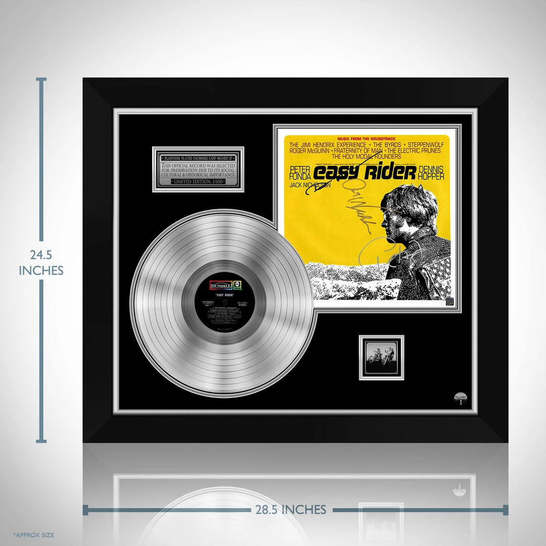 Pay homage to one of the most iconic movie of all time Easy Rider , with this gallery-framed, authentic Reprise records fully licensed facsimile of the official Hand-Signed Platinum Plated LP Record and LP Cover Soundtrack Originally signed by filmmaker Jack Nicholson, writer, director & actor, the late great Dennis Hopper & writer, producer & actor, the late great Peter Fonda , of which is strictly limited to 100 units Worldwide and has been approved and numbered accordingly.