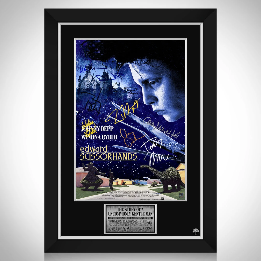 Pay homage to one of the most iconic films of all time, Edward Scissorhands, with this gallery-framed, officially licensed, limited edition facsimile of hand-signed movie mini poster, originally signed by Tim Burton, Johnny Depp, Dianne Wiest, Kathy Baker, Alan Arkin, Winona Ryder, Anthony Michael Hall, Vincent Price and Danny Elfman, of which is strictly limited to 100 units Worldwide, and has been approved and numbered accordingly.