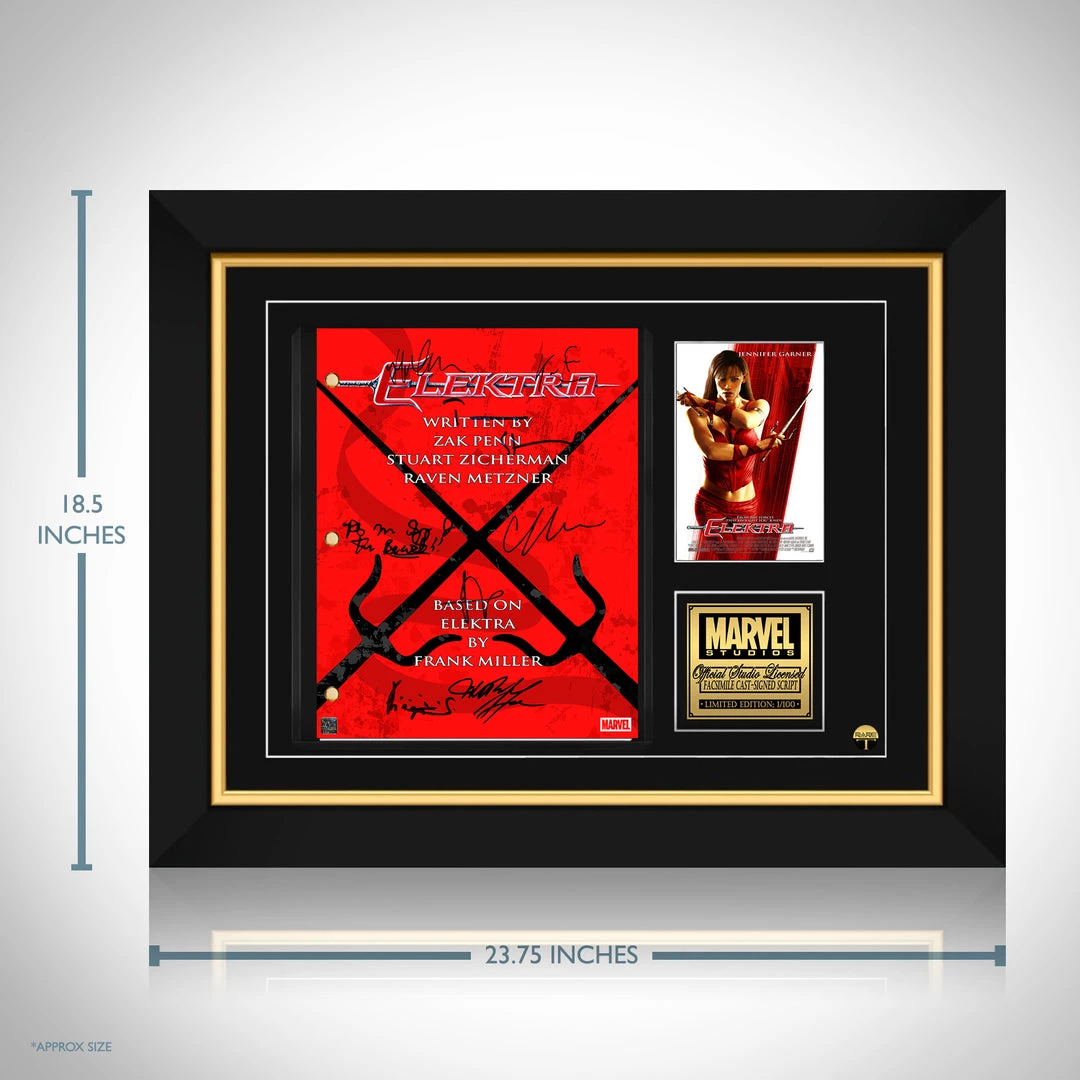 Pay homage to Elektra , with this Marvel Studios fully licensed facsimile of the official signed TV Series script, originally signed by actors Jennifer Garner, Goran Visnjic, Will Yun Lee, Cary-Hiroyuki Tagawa, Terence Stamp, Kevin Feige, Stan Lee, Bob Sapp & Jason Isaacs , of which is strictly limited to 100 units Worldwide and has been approved and numbered accordingly.