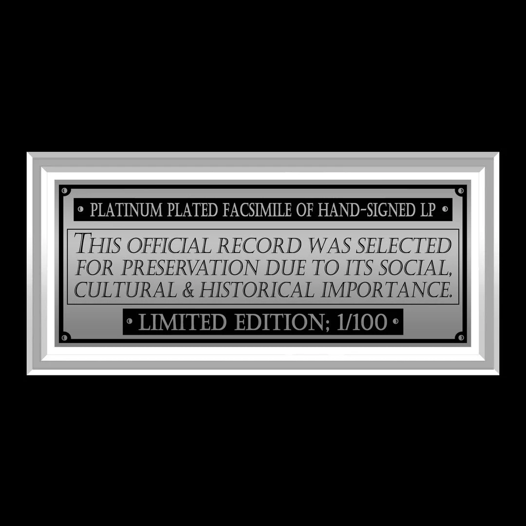 The Platinum Plated LP and album cover facsimile are both professionally mounted in the highest quality triple matted wood shadow box frame with metallic fillet trim and finished with protective glass to keep it looking pristine. The customized descriptive metallic plaque, in addition to the detailed finishing and openings, add to the elegant and sophisticated gallery quality look.