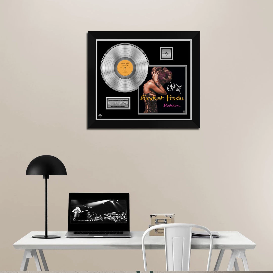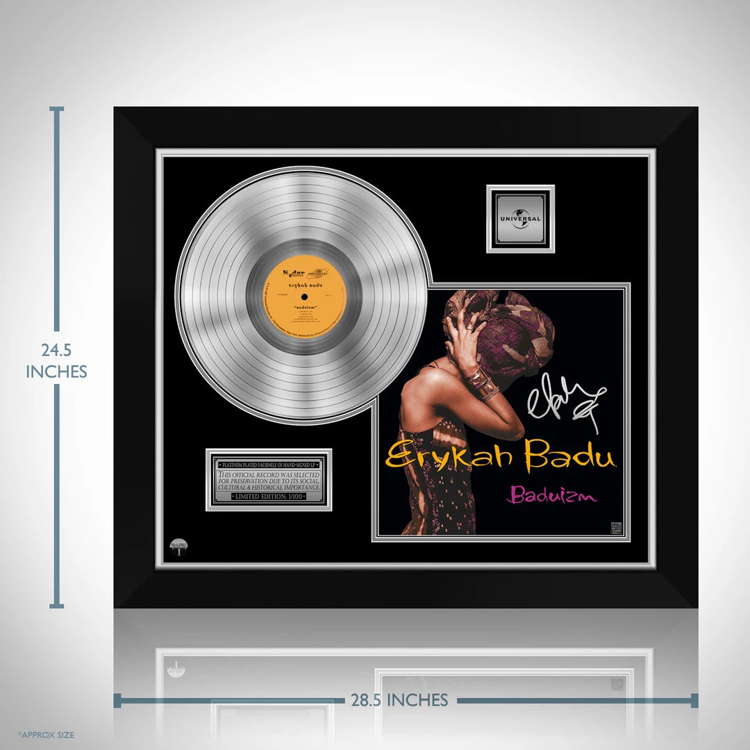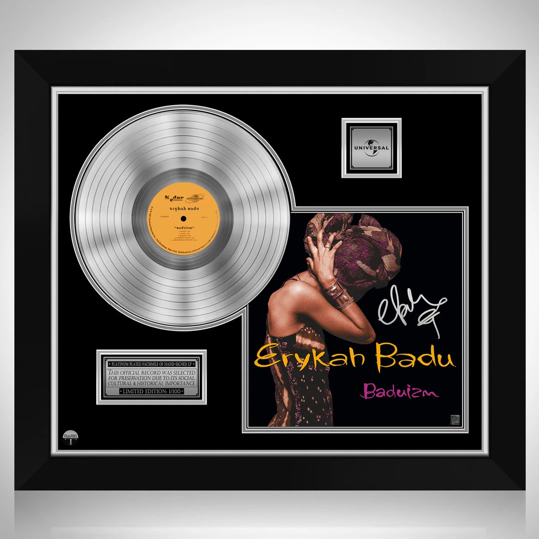Pay homage to one of the most iconic American singer-songwriter of all time Erykah Badu , with this gallery-framed, authentic Universal Records fully licensed facsimile of the official Hand-Signed Platinum Plated LP Record and LP Cover Baduizm Originally signed by Erykah Badu , of which is strictly limited to 100 units Worldwide and has been approved and numbered accordingly.